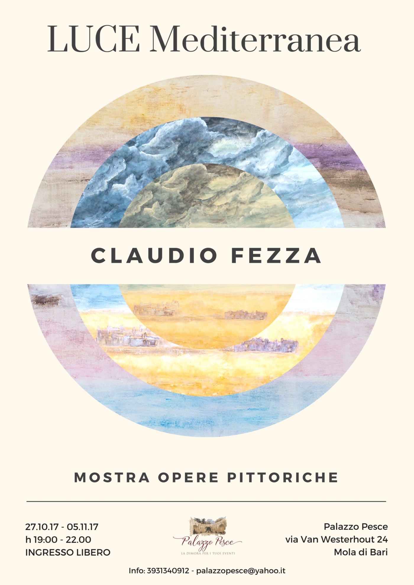 In autunno il mare lambisce le bianche mura di Palazzo Pesce a Mola di Bari: le azzurre suggestioni marine di Claudio Fezza saranno in esposizione dal 27 ottobre al 5 novembre.