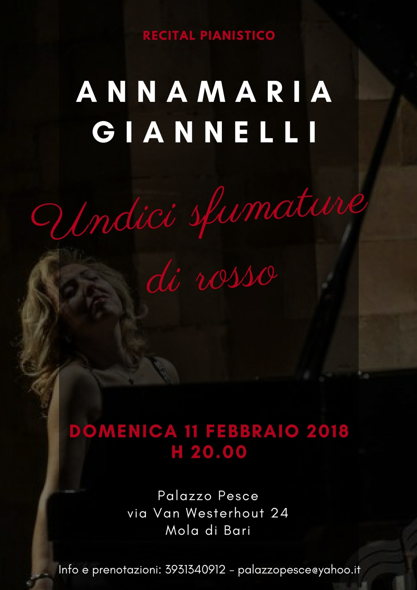 Annamaria Giannelli sarà protagonista al pianoforte di “Undici sfumature di rosso” a Palazzo Pesce a Mola di Bari domenica 11 febbraio.