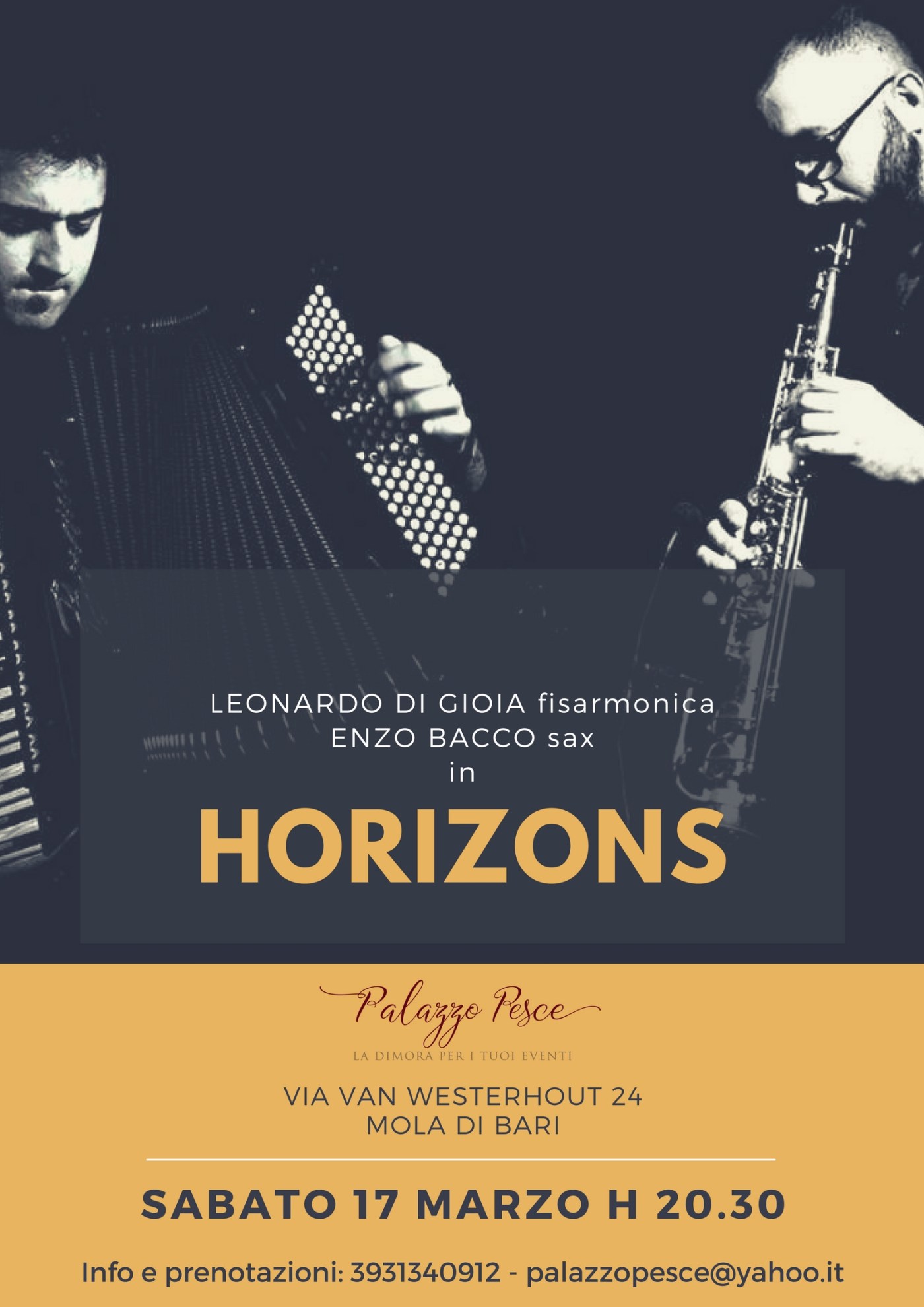 Horizons nasce dall’incontro fra la fisarmonica di Leonardo Di Gioia e il sassofono di Enzo Bacco, che hanno dato forma a un concerto mai identico a se stesso e in continua evoluzione: i due strumenti dialogano senza sosta con verve improvvisativa, battute estemporanee ed esiti sempre originali e mai prevedibili. I virtuosismi vibranti della fisarmonica si uniscono al fraseggio caldo e avvolgente del sassofono, proponendo un repertorio di brani ricercati che attinge e spazia tra le sonorità e i ritmi popolari sudamericani, argentini, balcanici e mediterranei. Horizons è un viaggio che supera gli orizzonti stilistici e territoriali e omaggia zone geografiche diverse del globo.