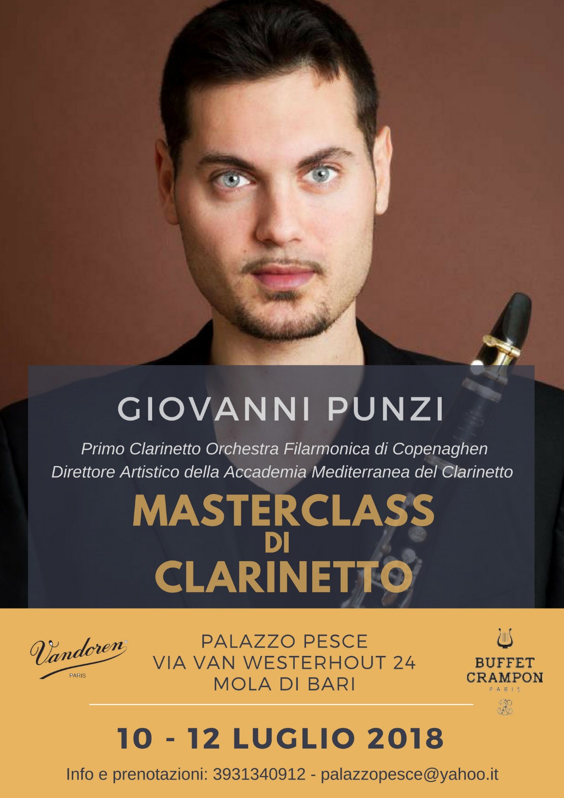 Da martedì 10 a giovedì 12 luglio 2018 Palazzo Pesce ospiterà la masterclass in Clarinetto del M° Giovanni Punzi. Primo Clarinetto solista dell’Orchestra filarmonica di Copenaghen, Giovanni Punzi si è diplomato giovanissimo con lode e menzione al Conservatorio di Salerno, ha continuato la propria formazione all’Accademia Perosi di Biella nella classe di Thomas Friedli, all’Accademia Italiana del Flauto con Calogero Palermo e all’Accademia Nazionale di Santa Cecilia con Alessandro Carbonare, per poi perfezionarsi con Philippe Berrod al Conservatorio Nazionale Superiore di Musica di Parigi, dove ottiene il Prix a l’Unanimitè. Gli aspetti relativi a emissione, tecnica e suono saranno l’oggetto di lavoro con i partecipanti, durante le lezioni individuali con la presenza di un pianista accompagnatore.