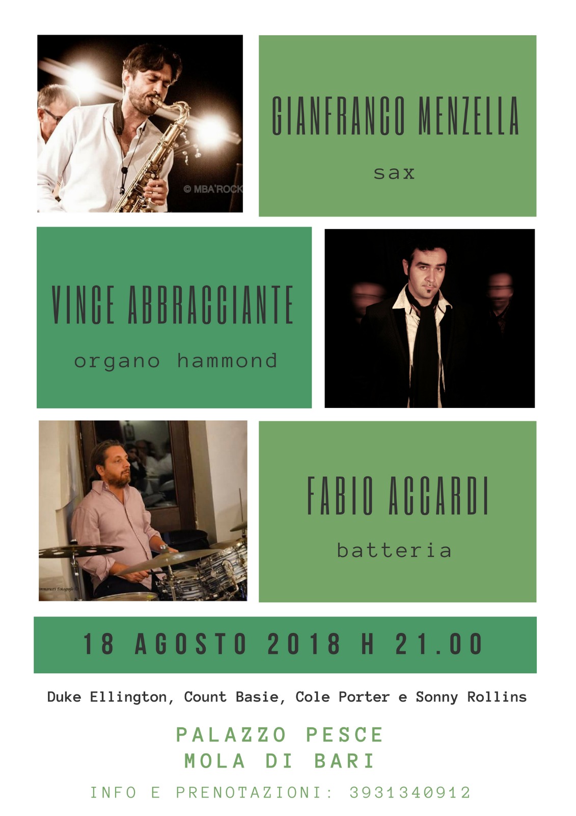 Sabato 18 agosto 2018 alle ore 21.00 a Palazzo Pesce il sax di Gianfranco Menzella, l’organo hammond di Vince Abbracciante e la batteria di Fabio Accardi si danno appuntamento per una serata all’insegna del grande jazz.