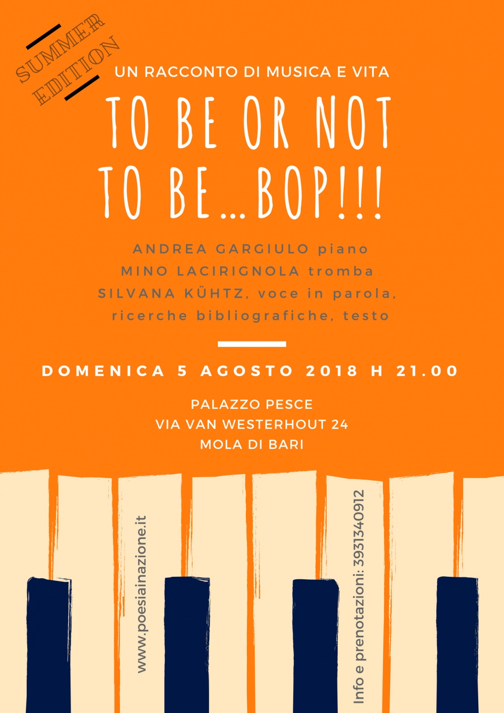 Dopo il sold out dello scorso 5 maggio, domenica 5 agosto alle ore 21.00 ritornano a Palazzo Pesce Andrea Gargiulo e Silvana Kühtz e il loro To Be or Not to Be…Bop!!! Ad arricchire questo concerto in Puglia fatto di musica e parole la partecipazione straordinaria di Mino Lacirignola.