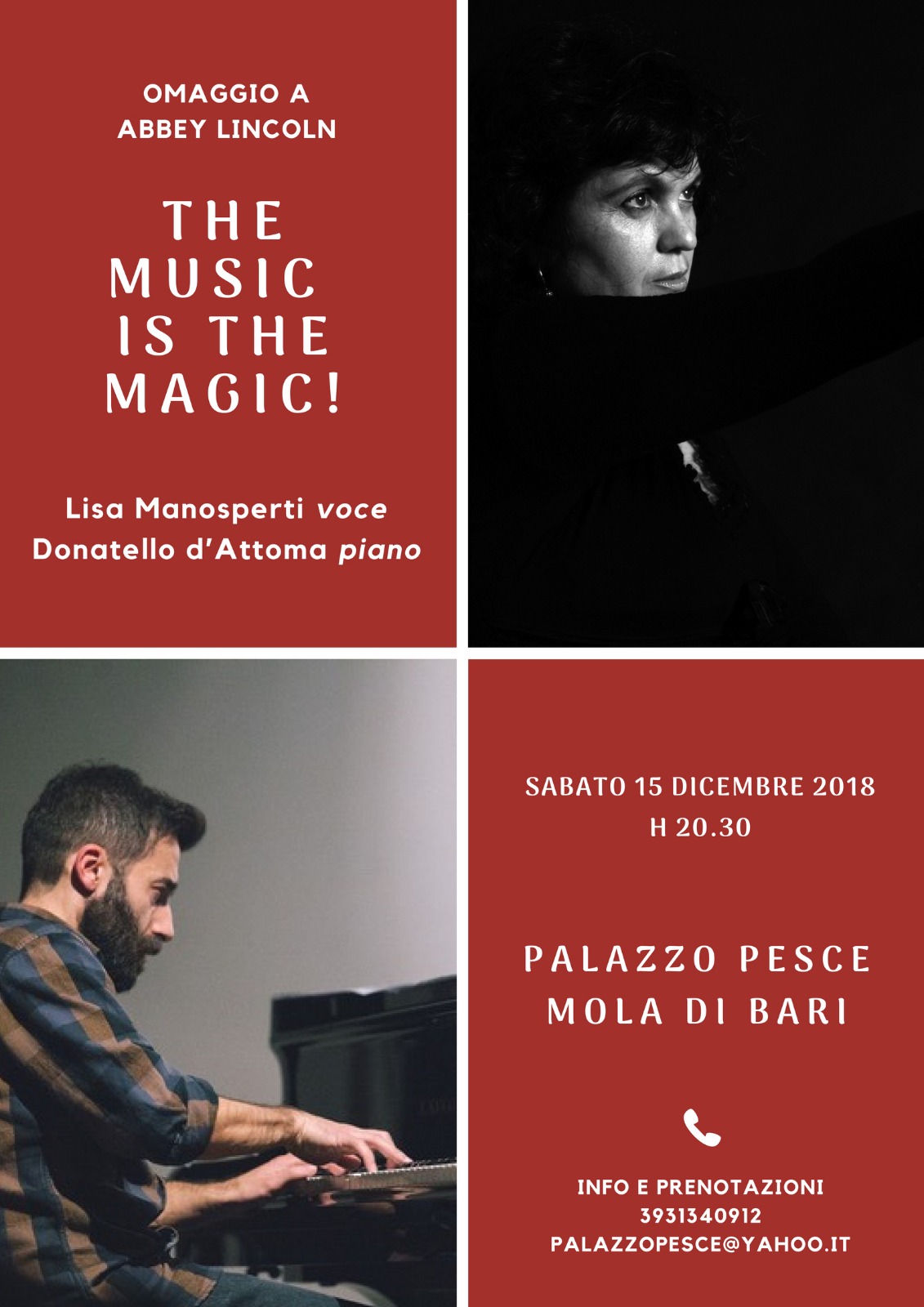 Sabato 15 dicembre 2018 alle ore 20.30 Palazzo Pesce si ammanta dell’atmosfera intima e segreta di “The music is the magic!” con Lisa Manosperti e Donatello d’Attoma.