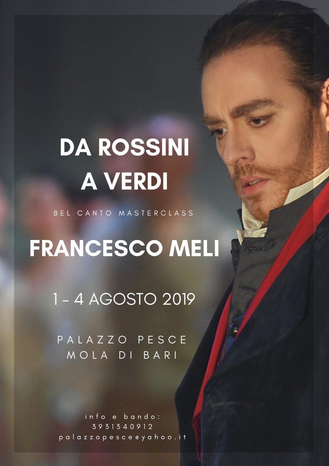 Da giovedì 1 a domenica 4 agosto 2019 a Palazzo Pesce risuoneranno le note del belcanto italiano durante la Masterclass “Da Rossini a Verdi” tenuta dal tenore Francesco Meli.