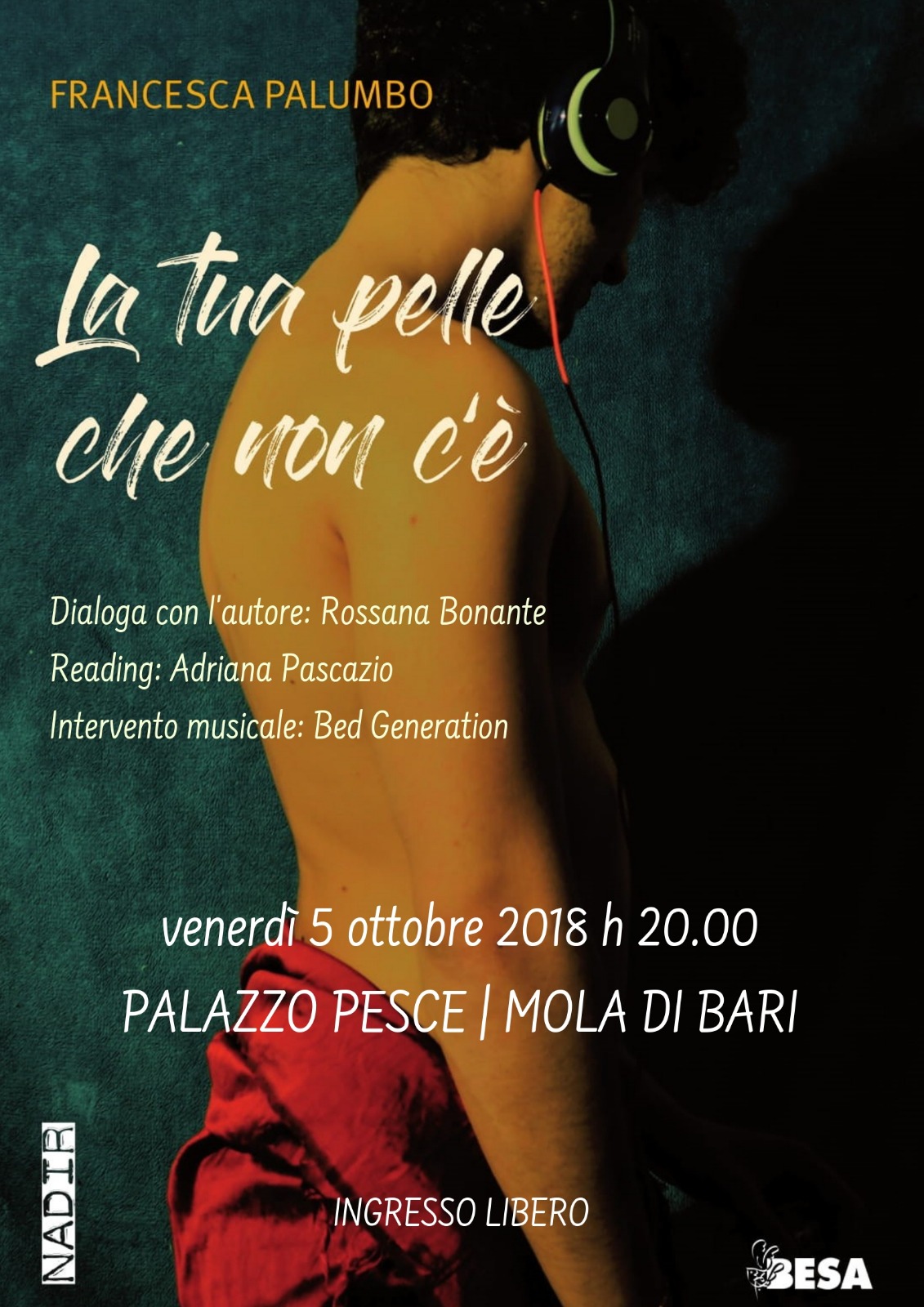 Venerdì 5 ottobre alle ore 20.00 Palazzo Pesce è il salotto letterario in cui Francesca Palumbo racconta il suo romanzo “La tua pelle che non c’è” insieme a Rossana Bonante, con le letture di Adriana Pascazio e l’intervento musicale della band ‘Bed Generation’ con Raffaele Santostasi, Carla Muolo e Francesco Cavaliere.