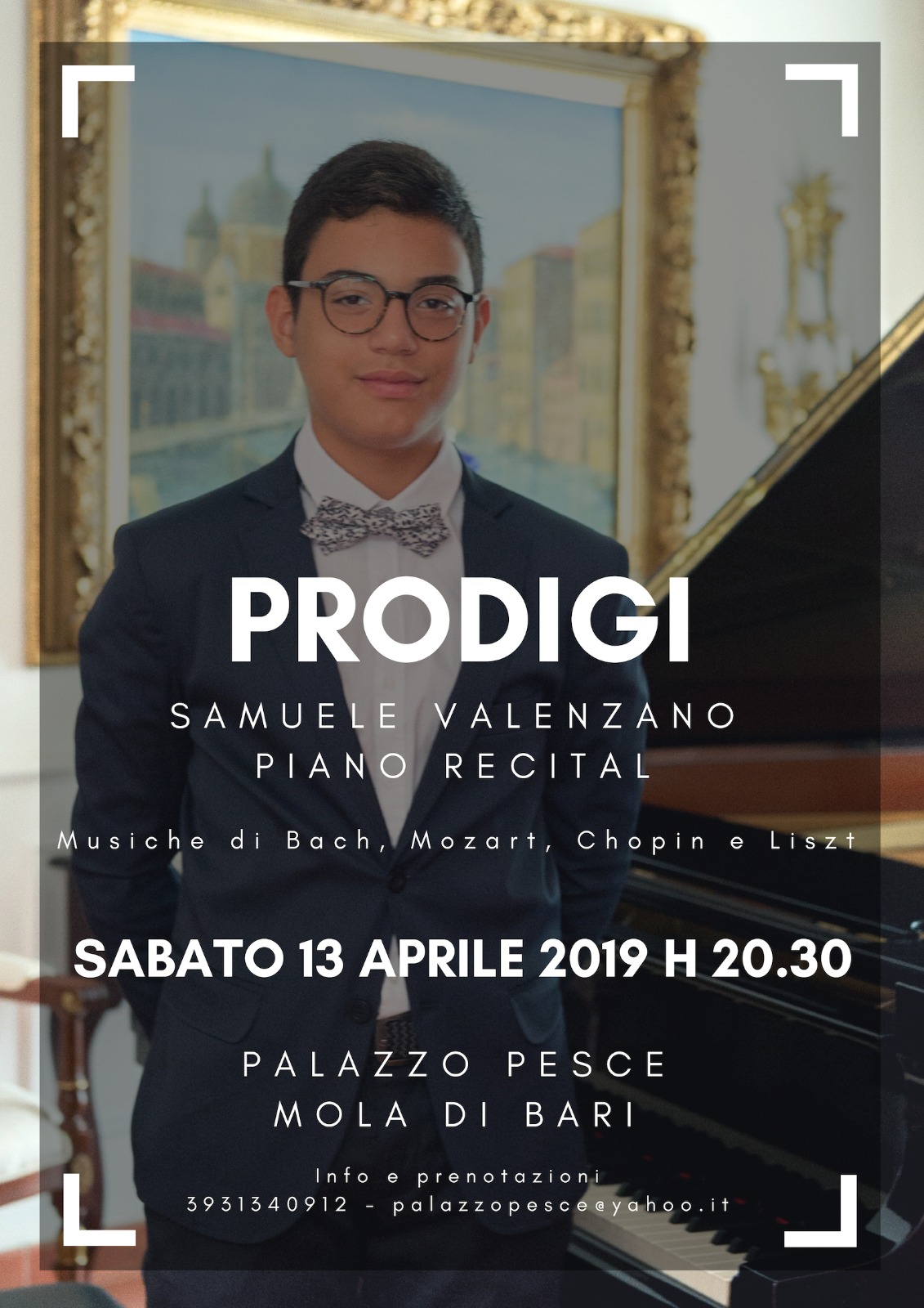 Sabato 13 aprile 2019 alle ore 20.30 Palazzo Pesce apre le porte al giovanissimo talento di Samuele Valenzano e al suo recital pianistico con musiche di Johann Sebastian Bach, Wolfgang Amadeus Mozart, Frederic Chopin e Franz Liszt.