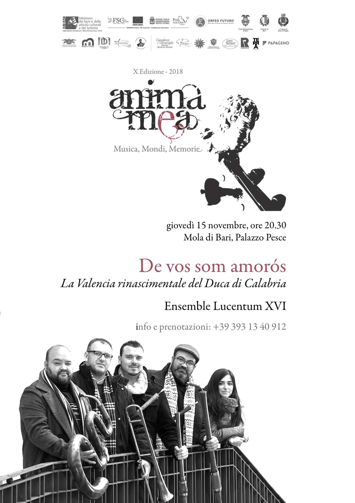Giovedì 15 novembre 2018 alle ore 20.30 a Palazzo Pesce l’Ensemble Lucentum XVI fa rivivere la Valencia rinascimentale del Duca di Calabria con “De vos som amorós”.