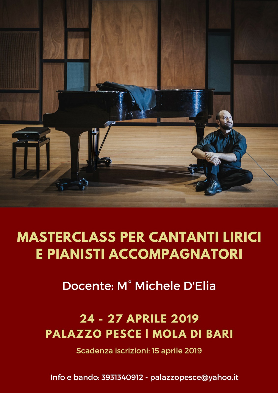Da mercoledì 24 a sabato 27 aprile 2019 Palazzo Pesce diventa il palco d’opera della Masterclass per Cantanti lirici e Pianisti accompagnatori tenuta dal Maestro Michele D’Elia, uno dei principali collaboratori al pianoforte per l’attività didattica e artistica dell’Accademia Teatro alla Scala di Milano, pur estendendo l’attività di docenza anche presso l’Accademia del Maggio Musicale Fiorentino e la Lunenburg Academy in Canada.