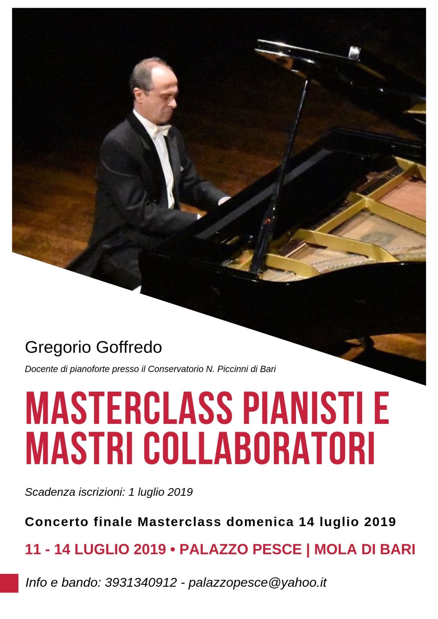 Da giovedì 11 a domenica 14 luglio 2019 Palazzo Pesce ospita la VII edizione della Masterclass di perfezionamento per pianisti solisti e maestri collaboratori tenuta dal Maestro Gregorio Goffredo, pianista, direttore d’orchestra, compositore e trascrittore per pianoforte, complessi strumentali e orchestre.