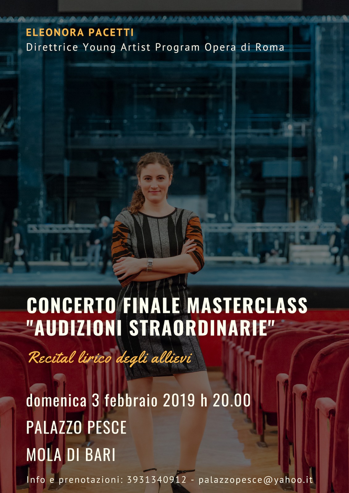 Domenica 3 febbraio 2019 alle ore 20.00 Palazzo Pesce ospita il concerto finale della seconda edizione di “Audizioni straordinarie. Masterclass per cantanti lirici”, tenuta da Eleonora Pacetti.