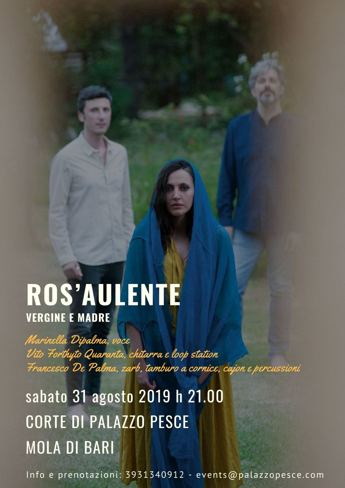Sabato 31 agosto 2019 alle ore 21.00 tra le pietre bianche della corte interna di Palazzo Pesce risuoneranno le sonorità mistiche e solenni di “Ros’Aulente. Vergine e Madre” con la voce di Marinella Dipalma, chitarra e loop station di Vito Quaranta e zarb, tamburo a cornice, cajon e percussioni di Francesco De Palma.