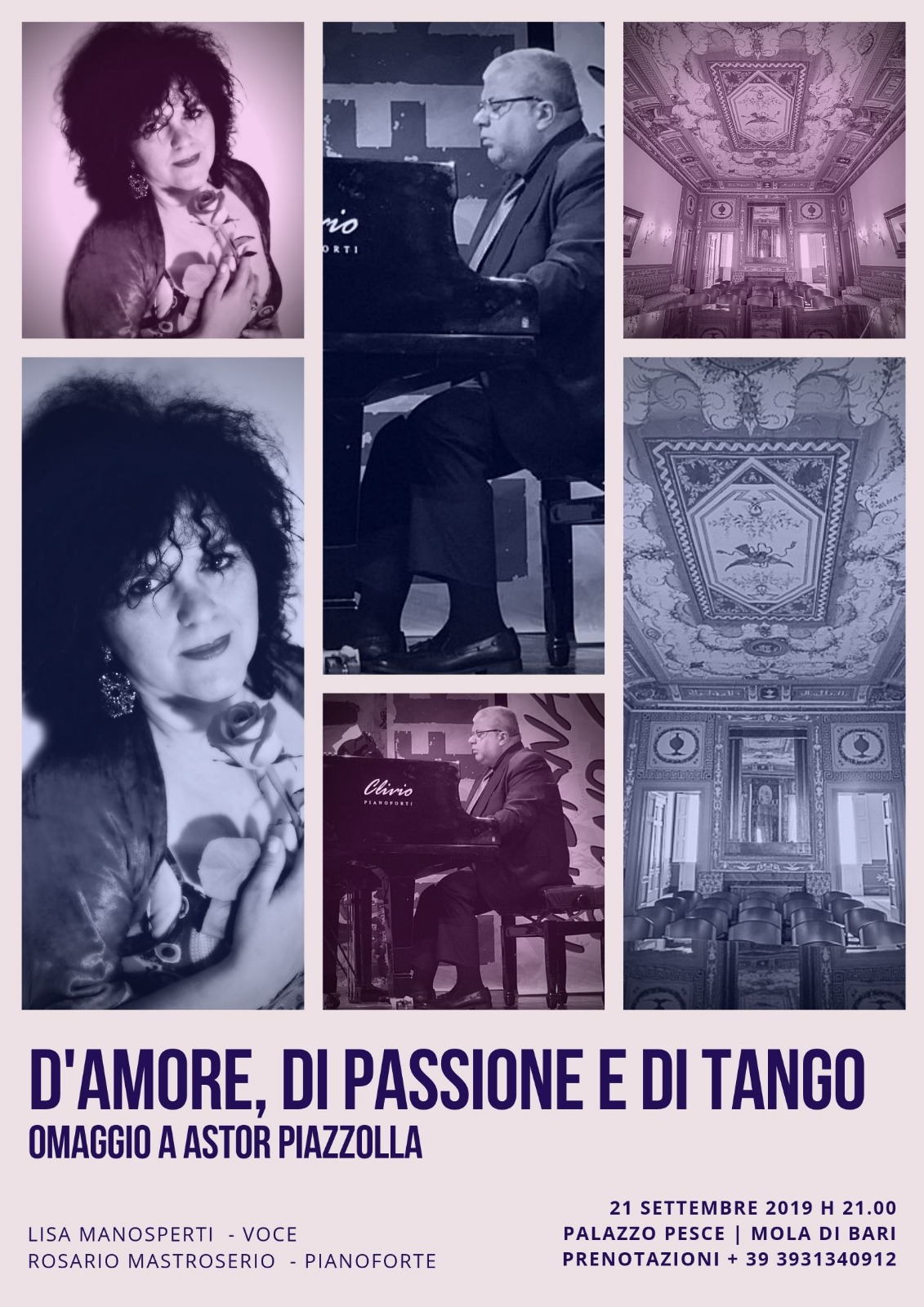 Sabato 21 settembre 2019 alle ore 21.00 a Palazzo Pesce si declineranno le molteplici sfumature del sentimento che fa girare il mondo con “D’amore, di Passione e di Tango” insieme alla voce di Lisa Manosperti e al pianoforte di Rosario Mastroserio.