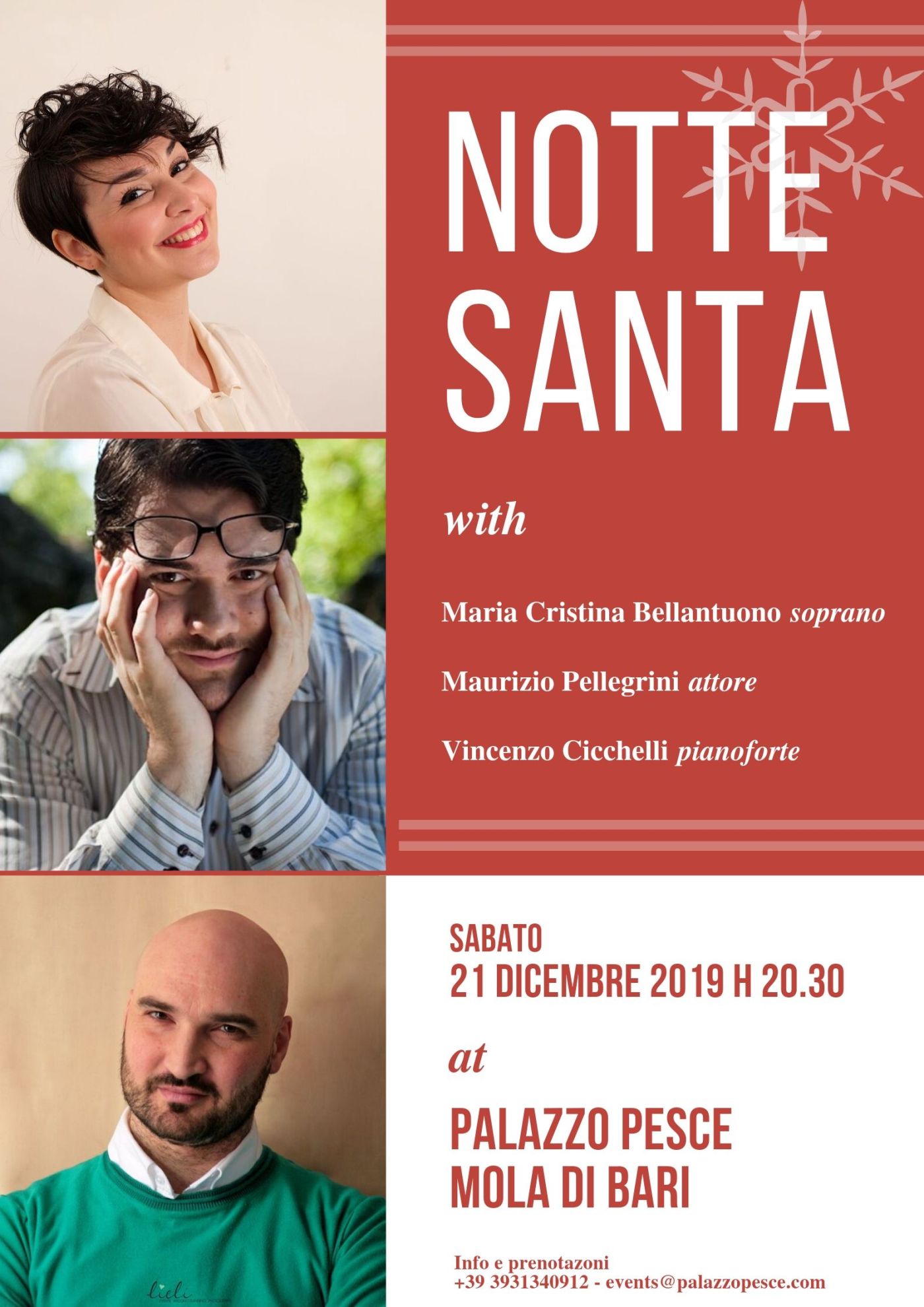 Sabato 21 dicembre 2019 alle ore 20.30 Palazzo Pesce canta la “Notte Santa” insieme al soprano Maria Cristina Bellantuono e alla voce recitante Maurizio Pellegrini accompagnati dal pianista Vincenzo Cicchelli.
