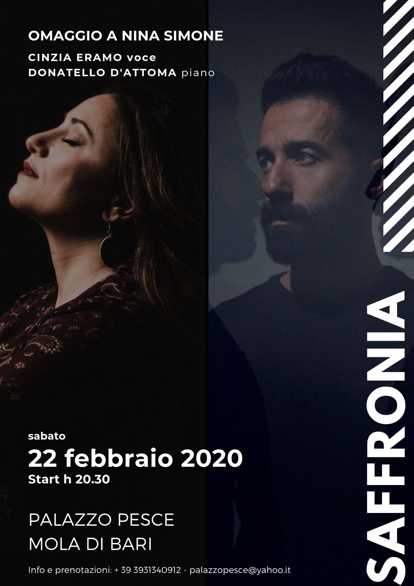 Sabato 22 febbraio 2020 alle ore 20.30 a Palazzo Pesce va in scena “Saffronia. Omaggio alla musica di Nina Simone” con la voce di Cinzia Eramo e il pianoforte di Donatello D’Attoma.