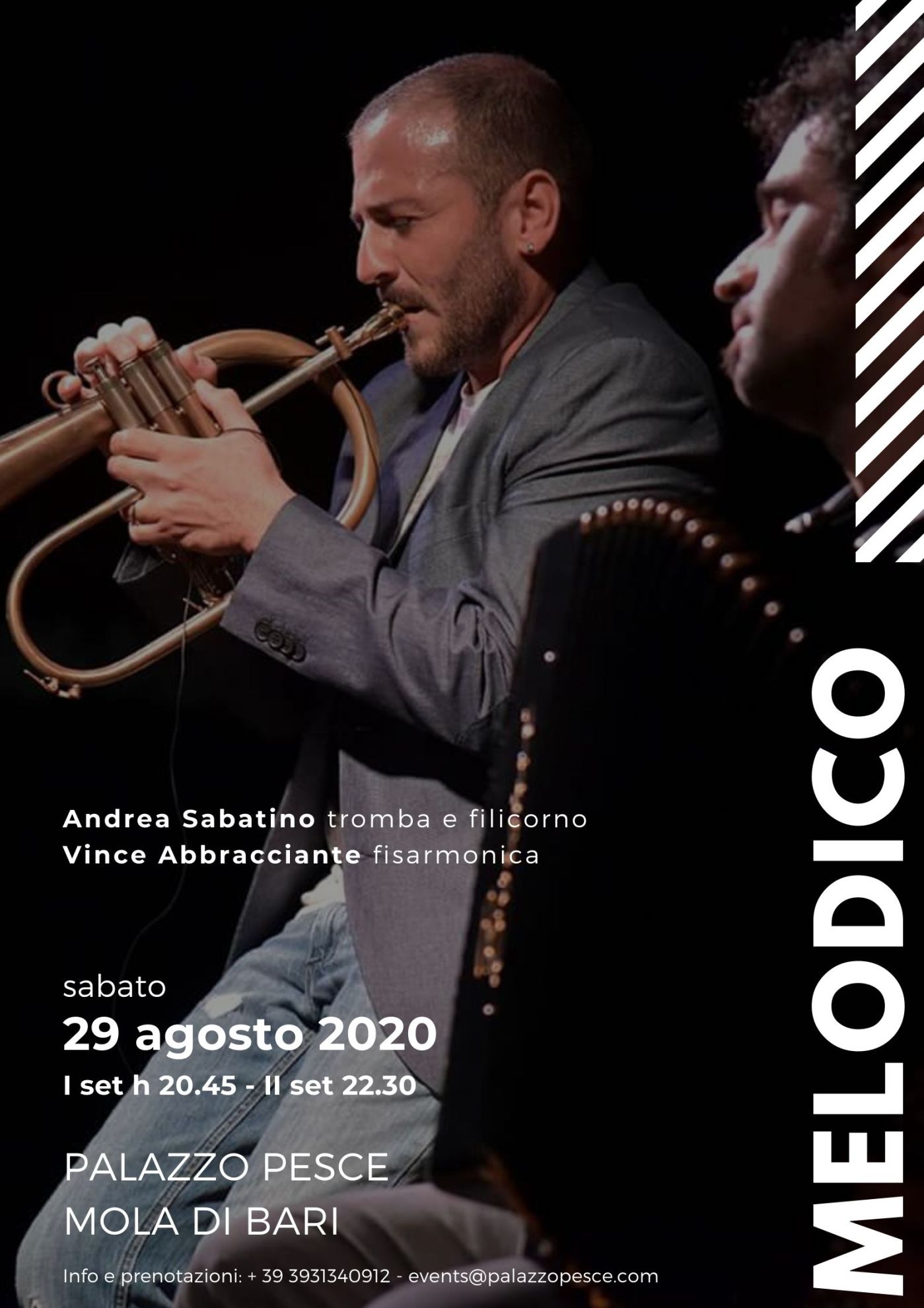 Sabato 29 agosto 2020 alle ore 20.45 (I set), 22.30 (II set) Palazzo Pesce si riempie delle sonorità di “Melodico” con la tromba e il flicorno di Andrea Sabatino e la fisarmonica di Vince Abbracciante.