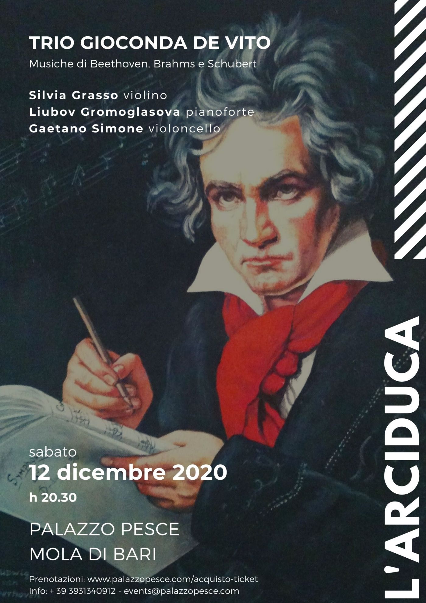 Sabato 12 dicembre 2020 alle ore 20.30 a Palazzo Pesce risuonano le note di “Archduke”, il concerto per festeggiare il 250° anniversario della nascita di Ludwig van Beethoven, con il violino di Silvia Grasso, il violoncello di Gaetano Simone e il pianoforte di Liubov Gromoglasova, ovvero il Trio Gioconda De Vito.