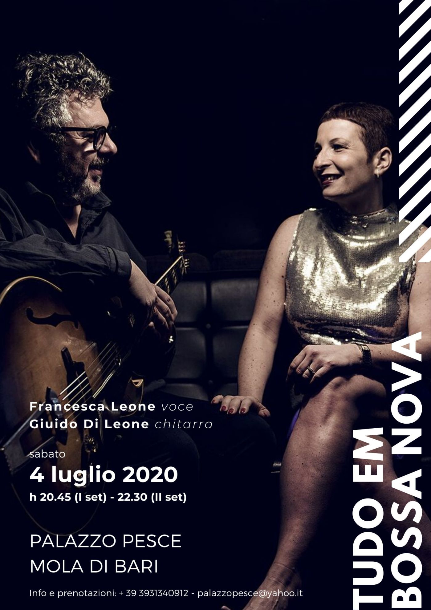 Un concerto in Puglia per ascoltare canzoni note e meno note della tradizione carioca e non, ammantate di quella saudade brasiliana che è entrata a far parte della cultura musicale di tutto il mondo dando nuova vita e sfumature alle sue melodie. La bossa nova, movimento culturale e musicale degli anni Sessanta nato dalla creatività di poeti e musicisti jazz, ha presto conquistato il pubblico internazionale grazie alle meravigliose composizioni dei suoi eroi, da Tom Jobim a Joao Gilberto, da Vinicius de Moraes a Baden Powell. Che rivivono nello stile puro di Francesca Leone, cantante jazz barese sensibile alle sonorità dei “crooner” bianchi e dei grandi interpreti della bossa nova, una carriera sui palcoscenici di importanti festival e rassegne jazz in Italia e all’estero e una ricca discografia fatta di numerose collaborazioni con artisti internazionali, e di Guido Di Leone, chitarrista e prolifico compositore barese, con più di 90 incisioni in diverse formazioni al proprio attivo e docente alla scuola “Pentagramma”, di cui è anche il direttore dal 1985.