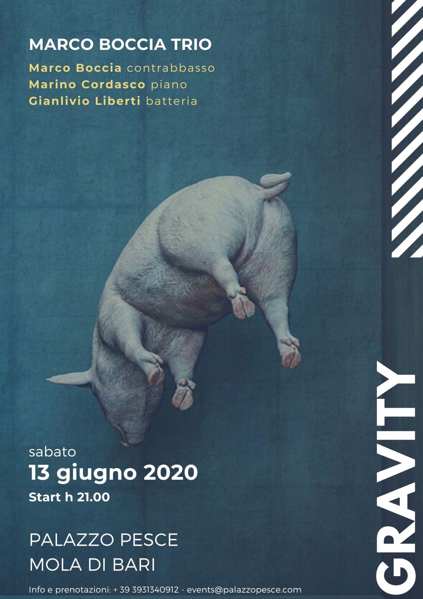 Sabato 13 giugno 2020 alle ore 21.00 a Palazzo Pesce ritornano Marco Boccia al contrabbasso, Marino Cordasco al pianoforte e Gianlivio Liberti alla batteria, alias il Marco Boccia Trio, per presentare “Gravity”.