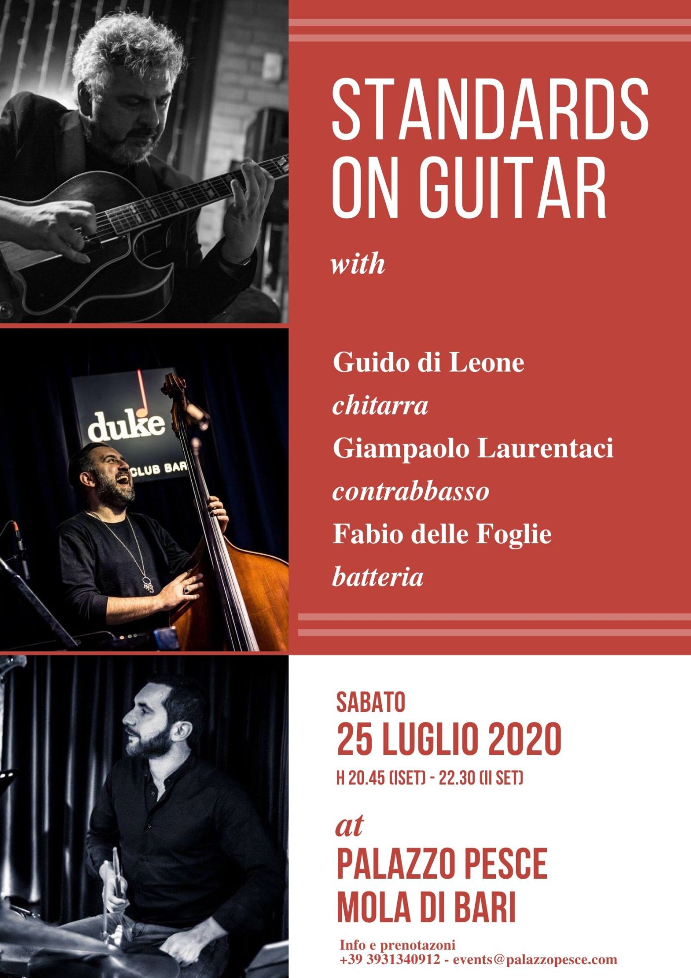 Sabato 25 luglio 2020 alle ore 20.45 (I set) e 22.30 (II set) Palazzo Pesce ospita le sonorità jazz di “Standards on Guitar” con la chitarra di Guido Di Leone, il contrabbasso di Giampaolo Laurentaci e la batteria di Fabio Delle Foglie.