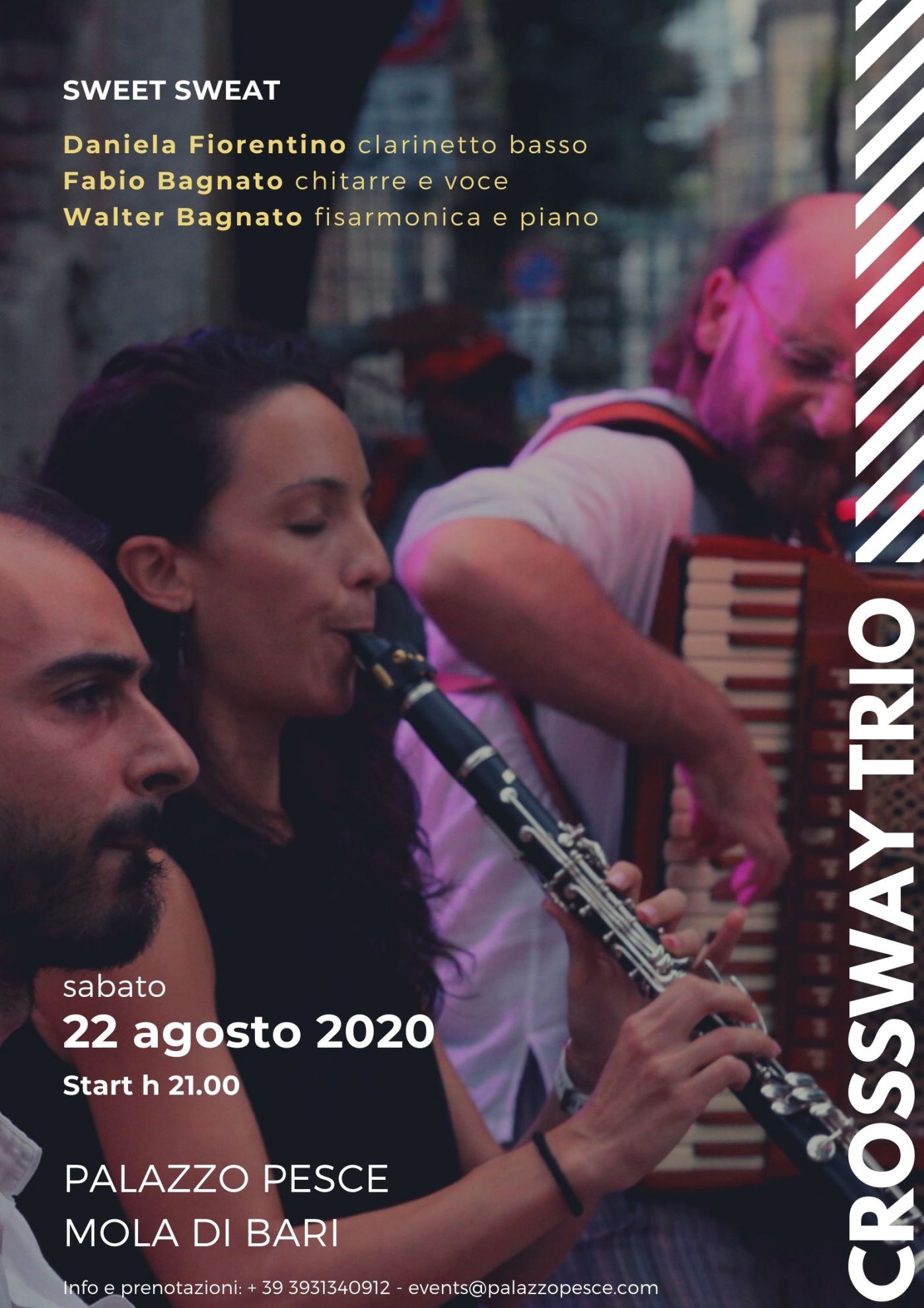 Sabato 22 agosto 2020 alle ore 21.00 a Palazzo Pesce si incrociano i generi musicali con “Sweet sweat”, il progetto discografico del Trio Crossway, formato da Daniela Fiorentino al clarinetto basso, Fabio Bagnato alle chitarre e voce e Walter Bagnato alla fisarmonica e pianoforte.
