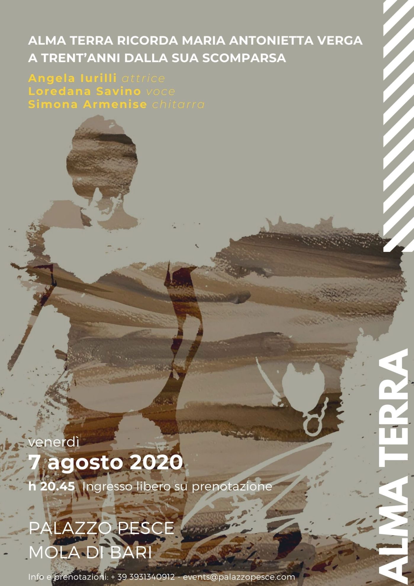 L’associazione Alma Terra – che organizza la serata insieme all’artista Giuseppe Verga, nipote di Maria Antonietta, a Mariangela Barbanente, Lucia Diomede e altri amici, per l’occasione sta realizzando una pubblicazione con le sue poesie, memoria della serata, riproponendo alcuni dei componimenti che furono pubblicati in un’antologia dal titolo “Marianto” dal mensile Realtà Nuove nel 1991, ma anche inediti, autografi e altro materiale che serva a ricordare e riscoprire la figura dell’autrice.