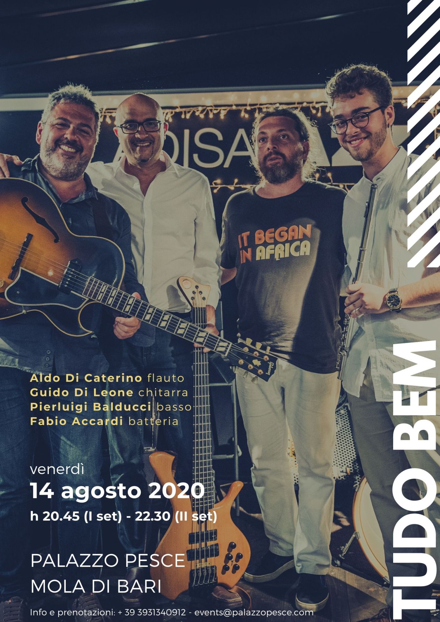 Venerdì 14 agosto 2020 alle ore 20.45 (I set) e 22.30 (II set) a Palazzo Pesce risuonano le note calde e passionali di Tudo Bem, il quartetto formato da Aldo Di Caterino al flauto, Guido Di Leone alla chitarra, Pierluigi Balducci al basso e Fabio Accardi alla batteria.