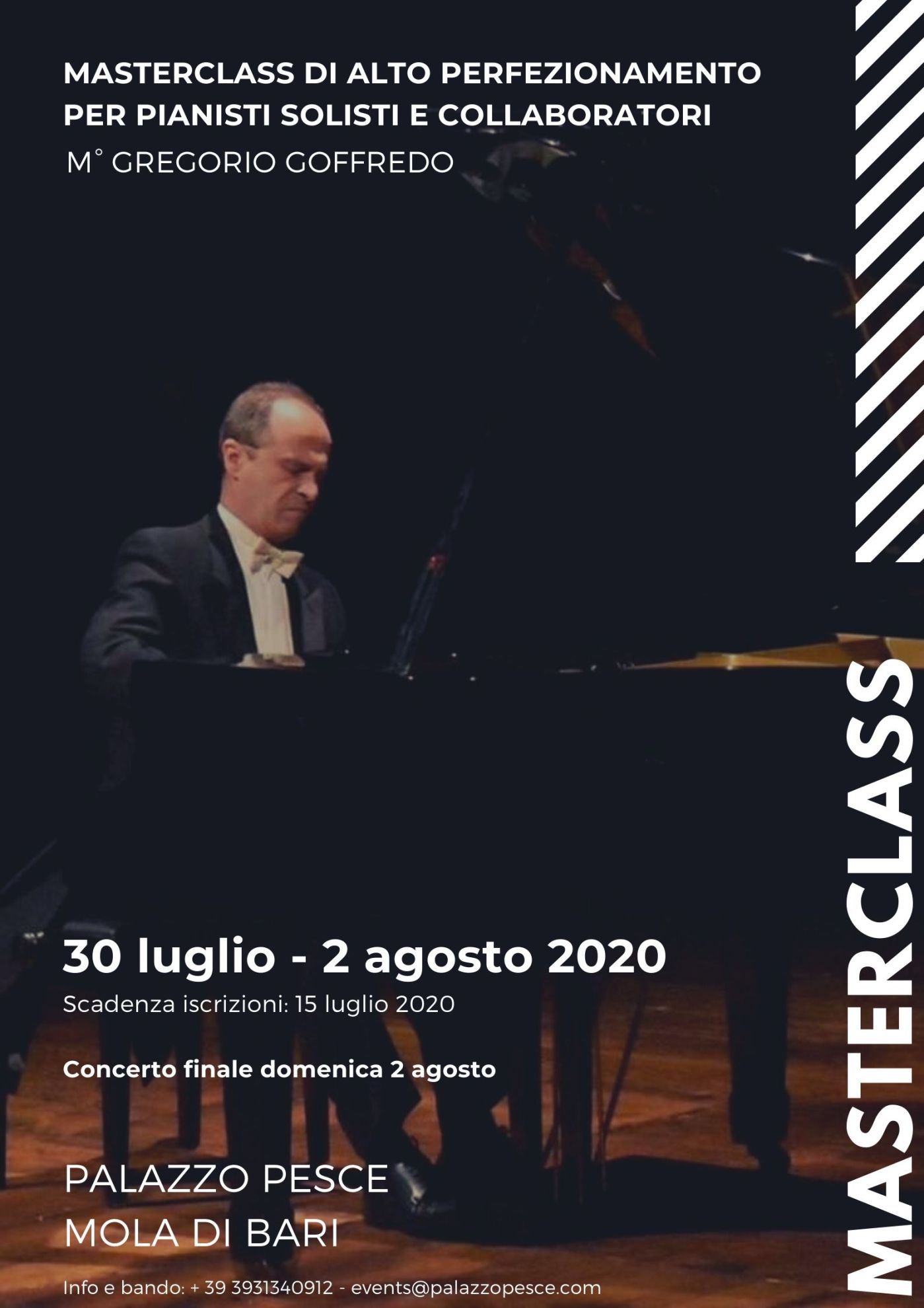 Da giovedì 30 luglio a domenica 2 agosto 2020 Palazzo Pesce ospita la VIII edizione della Masterclass di perfezionamento per pianisti solisti e maestri collaboratori tenuta dal Maestro Gregorio Goffredo, pianista, direttore d’orchestra, compositore e trascrittore per pianoforte, complessi strumentali e orchestre.