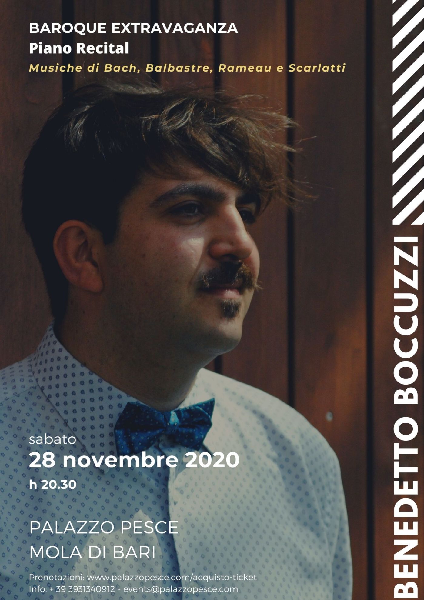 Un concerto in Puglia che elogia il ritmo pulsante e vitale della musica del Settecento: l’ascoltatore sarà vorticosamente condotto attraverso diversi ‘affetti’ o sentimenti, da quelli più oscuri e gravi a quelli più frivoli e brillanti. Nella prima metà del programma “Aria variata (alla maniera italiana)” BWV 989 di Johann Sebastian Bach, un brano giovanile del 1709 in cui a un tema concepito a mo’ di severo corale seguono dieci estrose variazioni, e un estratto – Allemanda, Sarabanda e la celebre Gavotta variata – dalla “Suite in la minore” del 1728 di Jean-Philippe Rameau; mentre la seconda metà del programma si apre con tre fantasiosi “Pieces de Clavecin” del 1759 di Claude-Bénigne Balbastre e si conclude con una selezione di cinque “Sonate” di Domenico Scarlatti. Pagine ricercate e accostate dalla sensibilità artistica di Benedetto Boccuzzi, eclettico e appassionato pianista e compositore, un repertorio che spazia dalle pagine antiche di Girolamo Frescobaldi e Henry Purcell alle composizioni di musicisti viventi, una carriera che lo vede esibirsi in tutta Europa come pianista, clavicembalista e continuista e con due ensemble di musica contemporanea – Zahir Ensemble a Siviglia e Teatro Lirico Sperimentale a Spoleto –, e numerose composizioni debuttate in Italia, Spagna e Romania.