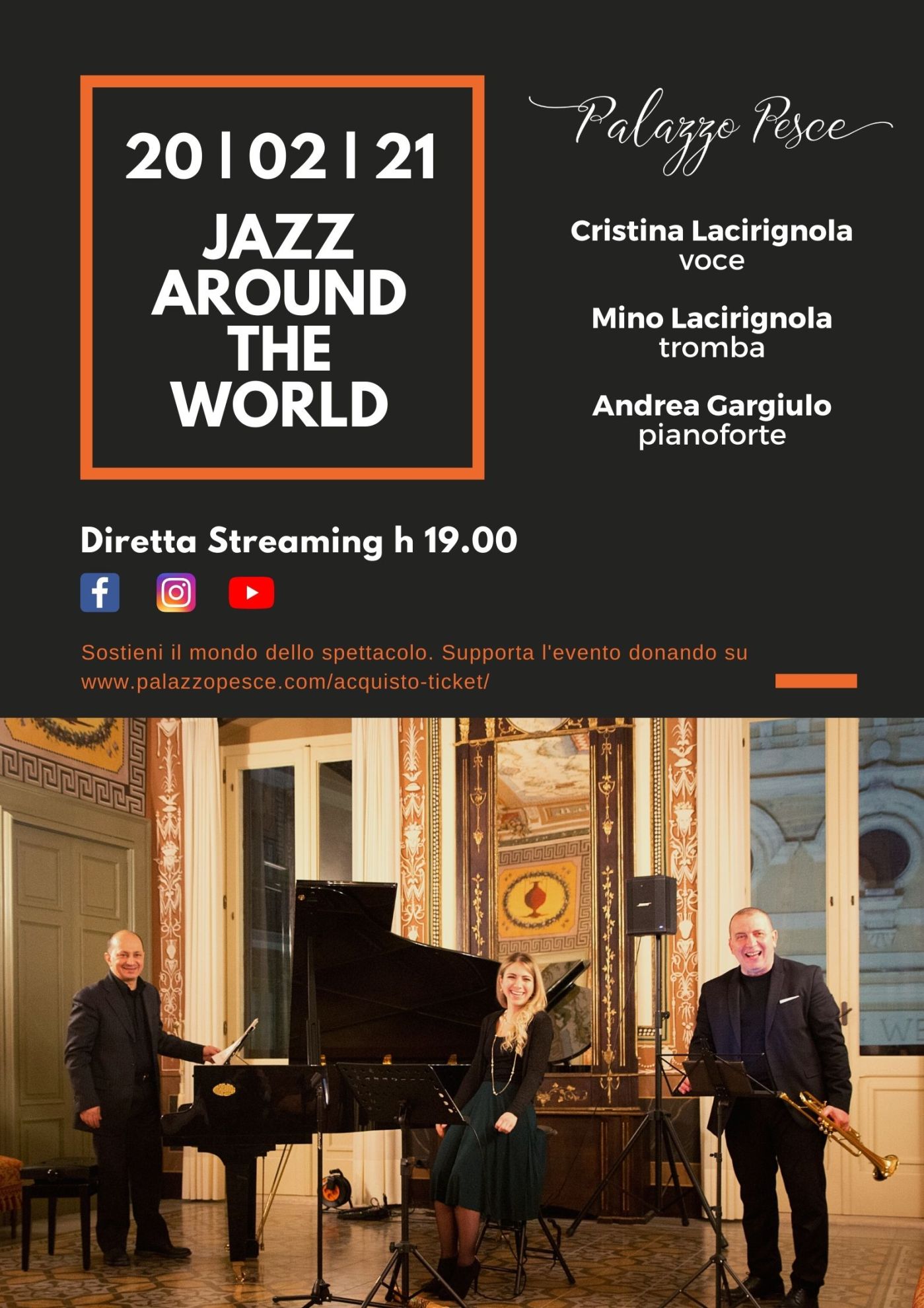Sabato 20 febbraio 2021 alle ore 19.00 Palazzo Pesce, in diretta streaming sui suoi canali social, presenta “Jazz Around the World” insieme alla voce di Cristina Lacirignola, la tromba di Mino Lacirignola e il pianoforte di Andrea Gargiulo.