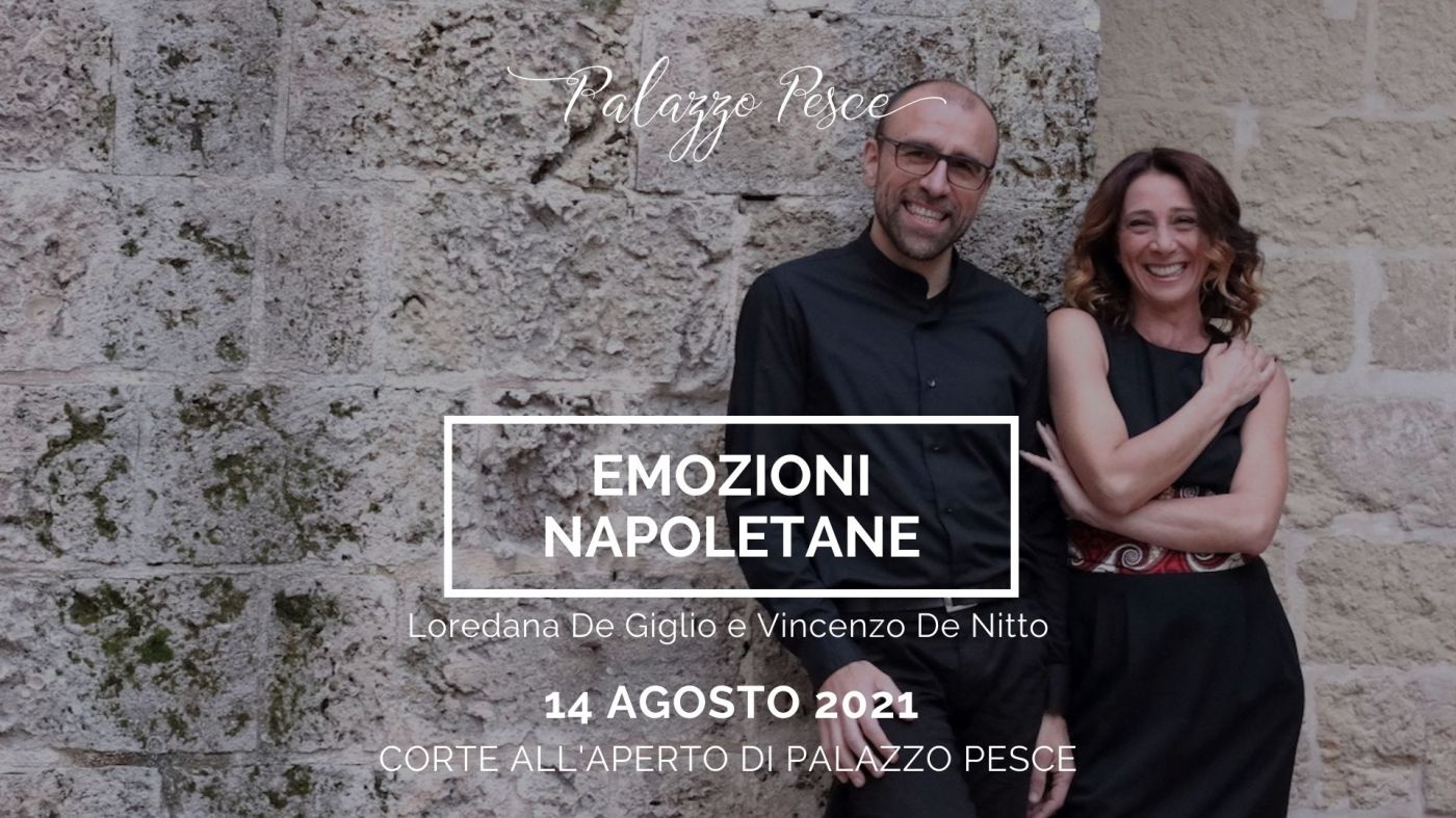 Sabato 14 agosto 2021 alle ore 20.45 Palazzo Pesce si lascia trasportare dalle “Emozioni napoletane” insieme alla voce della cantattrice Loredana De Giglio e alla fisarmonica di Vincenzo De Nitto.