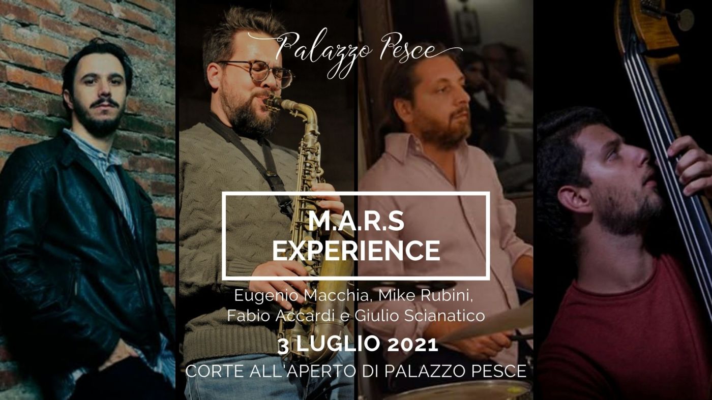 Sabato 3 luglio 2021 alle ore 20.45 Palazzo Pesce si anima delle sonorità underground europee con M.a.r.s., il collettivo con Eugenio Macchia al pianoforte, Fabio Accardi alla batteria, Mike Rubini al sassofono e Giulio Scianatico al contrabbasso.