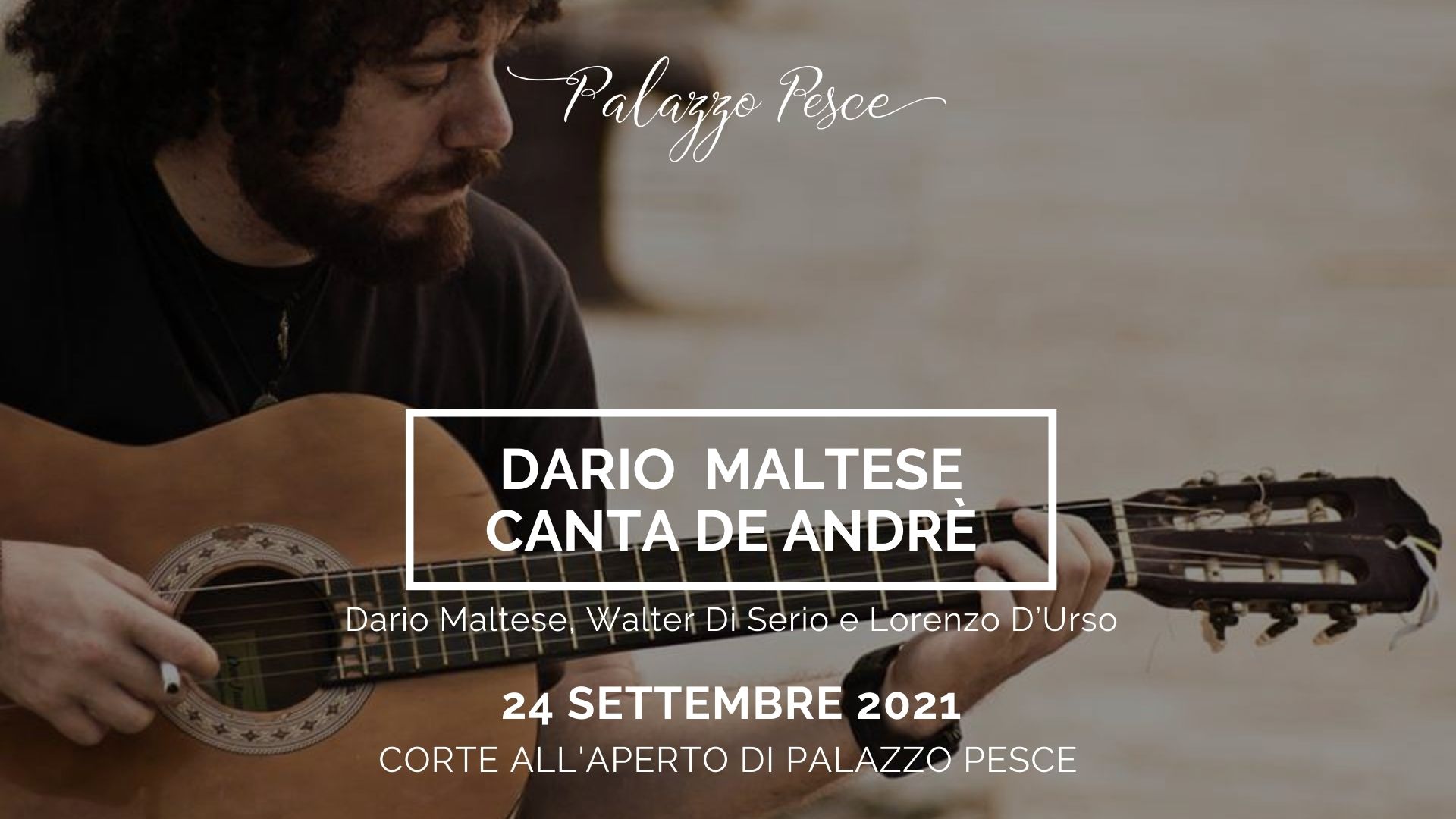 Venerdì 24 settembre 2021 alle ore 20.45 la corte all’aperto di Palazzo Pesce accoglie tra le sue pietre bianche “Diamanti nascosti nel pane”, l’omaggio a Fabrizio De André, con la voce di Dario Maltese, le chitarre di Walter Di Serio e la tastiera di Lorenzo D’Urso. Un concerto in Puglia per i veri intenditori delle … Continua a leggere 24 settembre 2021: Dario Maltese canta De Andrè