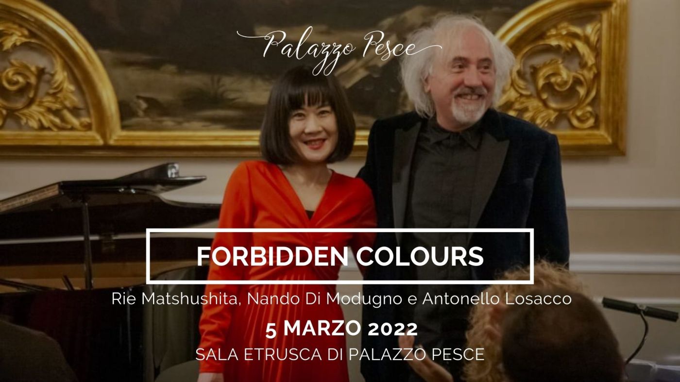 Sabato 5 marzo 2022 alle ore 21.00 Palazzo Pesce si tinge dei “Forbidden colours” della chitarra di Nando Di Modugno, del pianoforte di Rie Matsushita e del contrabbasso di Antonello Losacco.