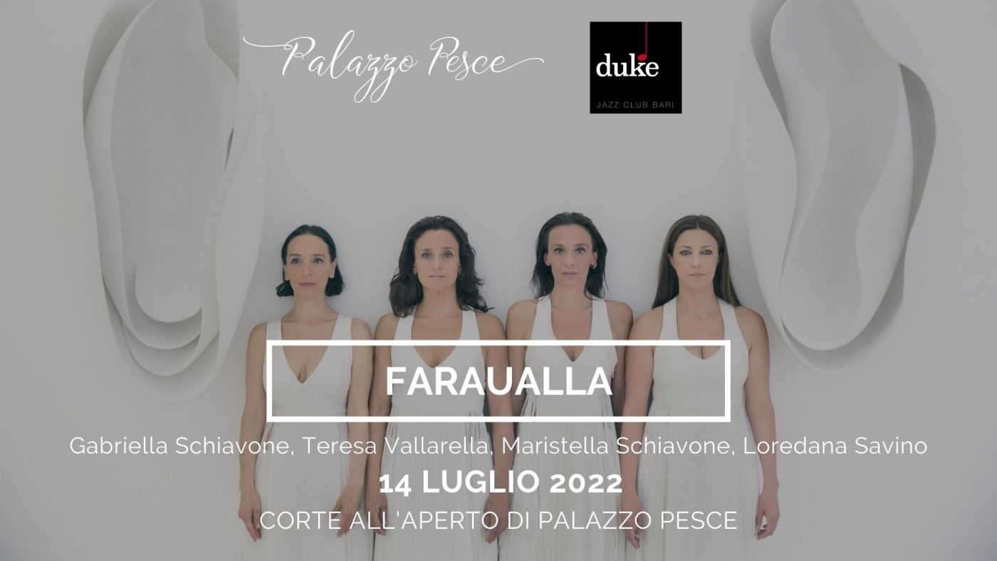 Un concerto in Puglia, in collaborazione con il Duke Jazz Club, per ascoltare le quattro voci dell’ensemble nato nel 1995, che dopo aver approfondito singolarmente lo studio e la pratica della vocalità in ambiti e repertori musicali distanti, hanno trovato un interesse comune nella ricerca della voce concepita e usata come strumento. I frutti di questo lavoro e di questa passione incessanti si ritrovano nel repertorio faraualla, nelle composizioni originali di Gabriella Schiavone così come nei brani tradizionali, nella pratica della polifonia e nella conoscenza delle espressioni vocali di etnie diverse e di diversi periodi storici.