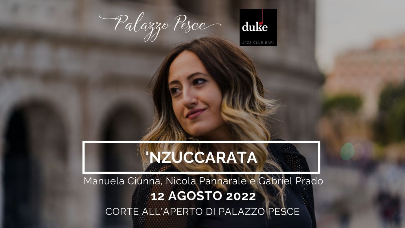 Venerdì 12 agosto 2022 alle ore 21.30 nella corte all’aperto di Palazzo Pesce risuona “‘’Nzuccarata” insieme alla voce e alla chitarra di Manuela Ciunna accompagnata dal duo Trip to Afrolatinjazz, formato dal pianista Nicola Pannarale e dal percussionista Gabriel Prado.