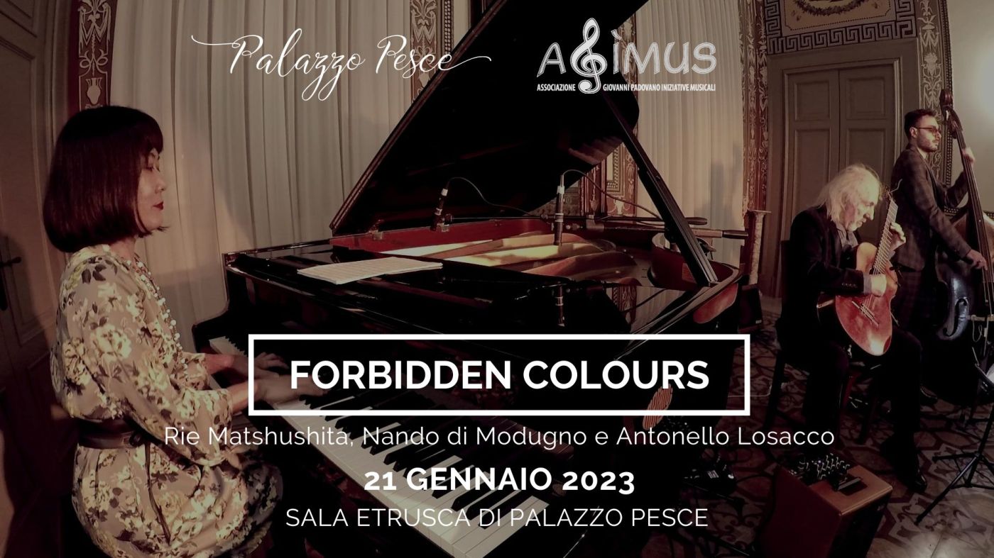 Sabato 21 gennaio 2023 alle ore 21.00 Palazzo Pesce si tinge dei “Forbidden colours” della chitarra di Nando Di Modugno, del pianoforte di Rie Matsushita e del contrabbasso di Antonello Losacco.