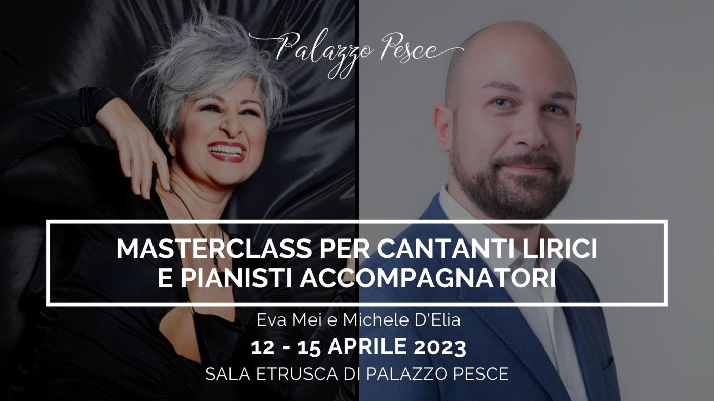 Da mercoledì 12 aprile a sabato 15 aprile 2023 Palazzo Pesce apre le porte alla Masterclass per Cantanti lirici e Pianisti accompagnatori tenuta dal soprano Eva Mei e dal pianista Michele D’Elia.