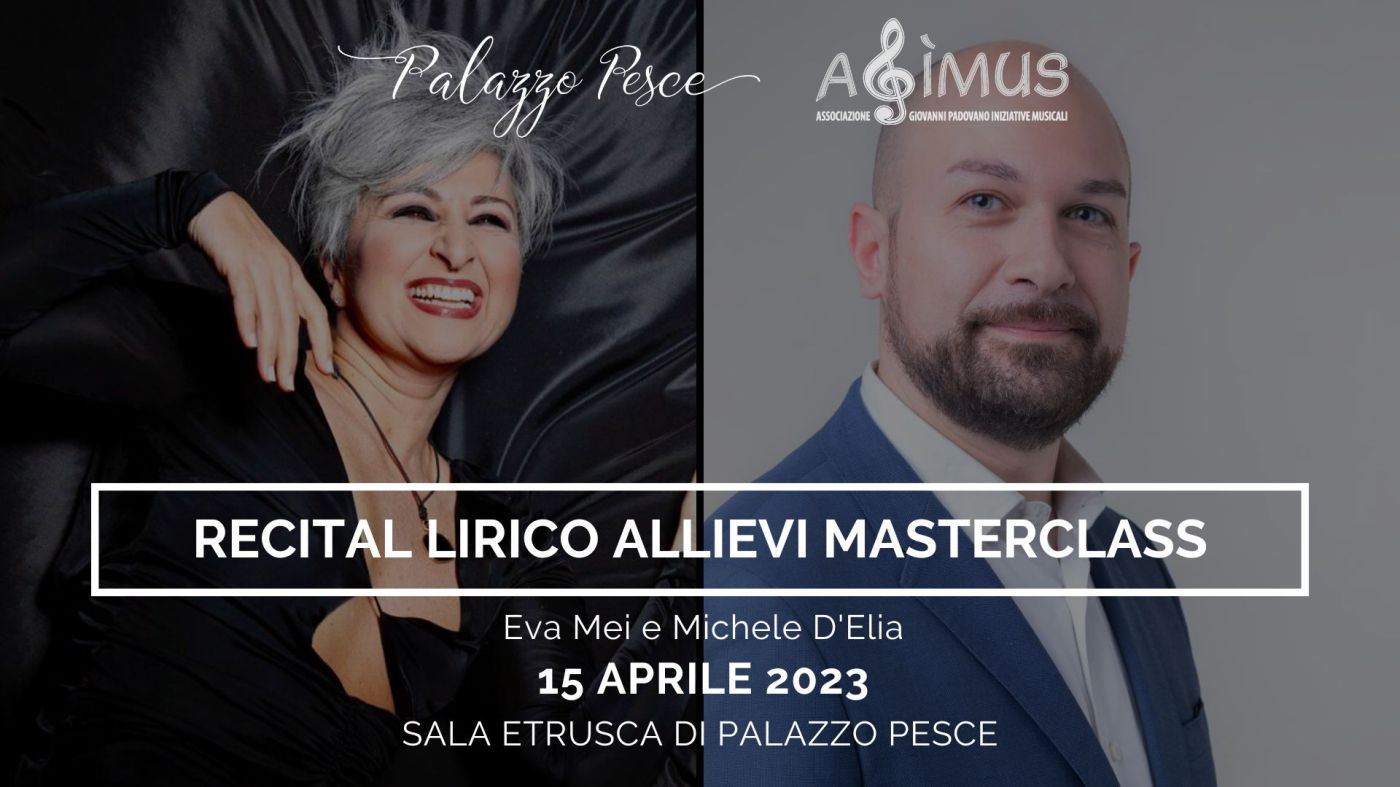 Sabato 15 aprile 2023 alle ore 21.00 Palazzo Pesce è la cornice del concerto finale della Masterclass per Cantanti lirici e Pianisti accompagnatori tenuta dal soprano Eva Mei, protagonista per oltre tre decenni nei maggiori teatri del mondo sotto la guida di direttori del calibro di Claudio Abbado, Zubin Mehta, Riccardo Muti e Lorin Maazel, e dal pianista Michele D’Elia, uno dei principali collaboratori al pianoforte per l’attività artistica e didattica all’Accademia del Teatro alla Scala di Milano.