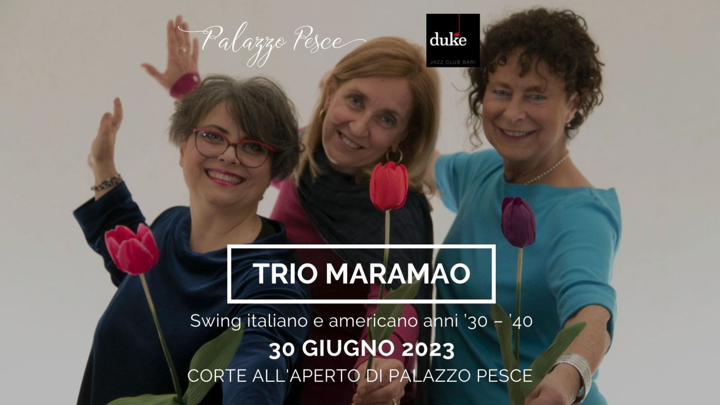 Venerdì 30 giugno 2023 alle ore 21.00 nella corte all’aperto di Palazzo Pesce è di scena il Trio Maramao, insieme alle voci di Margherita Diana, Annamaria La Rossa e Annarita Garofalo accompagnate alla batteria da Fabio Delle Foglie, al contrabbasso da Gianpaolo Chiarella e al pianoforte da Alessandro Binetti.