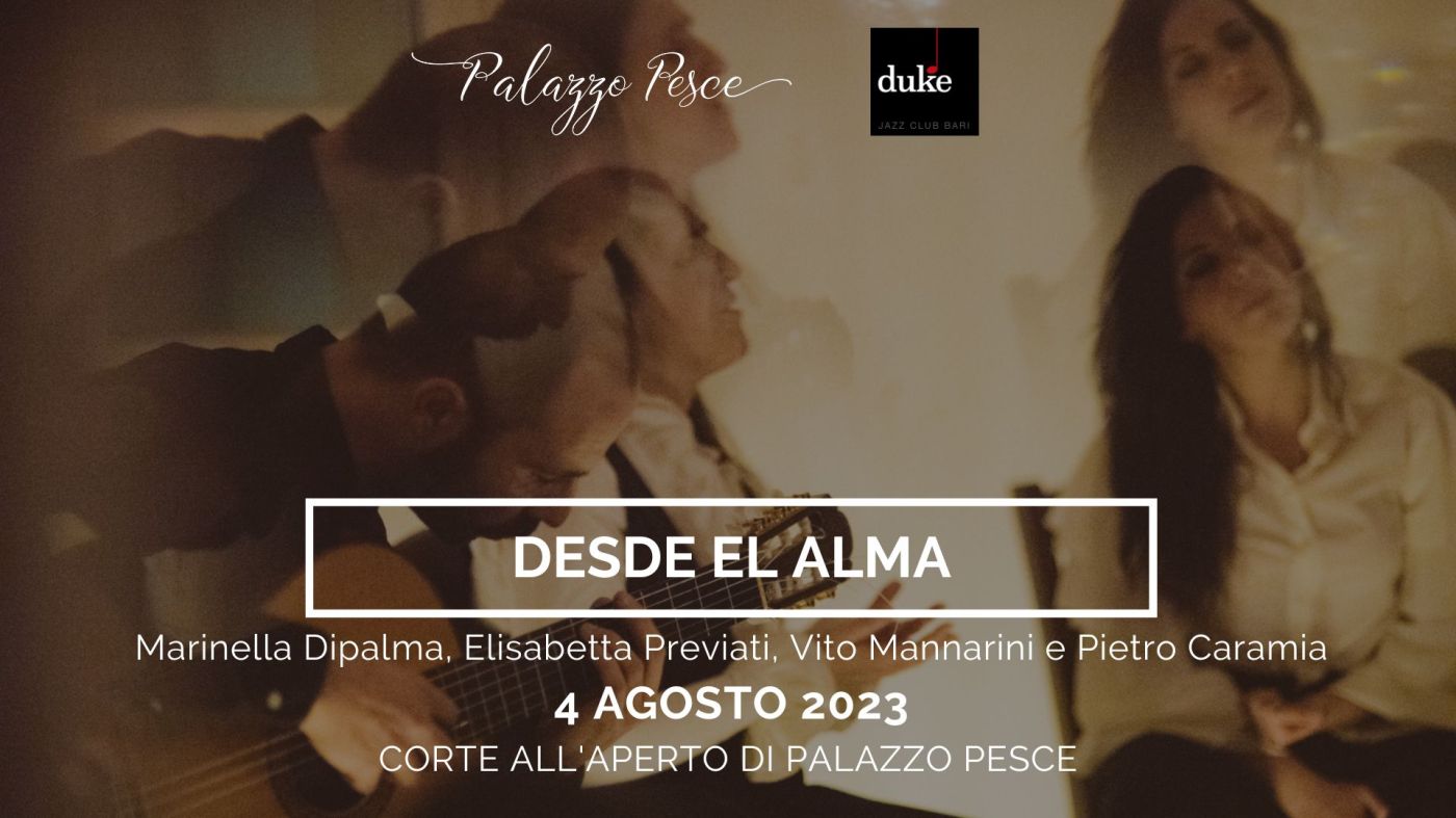 Venerdì 4 agosto 2023 alle ore 21.00 la corte all’aperto di Palazzo Pesce apre le porte a Desde el alma con Vito Mannarini alla chitarra, Elisabetta Previati e Marinella Dipalma voci, e la partecipazione dell’attore Pietro Caramia. Un concerto a Mola di Bari che, come già afferma il titolo, parte “dall’anima” e ripropone brani dell’epoca d’oro del tango argentino.