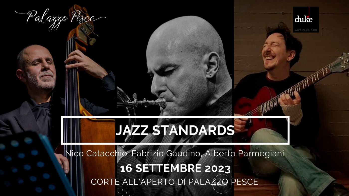Sabato 16 settembre 2023 alle ore 21.30 la corte all’aperto di Palazzo Pesce si apre allo spettacolo “Jazz Standards…Un viaggio attraverso le canzoni della musica americana. Aneddoti, storia, musica, testi, interpreti, compositori, eroi” con Nico Catacchio al contrabbasso, Fabrizio Gaudino alla tromba e flicorno e Alberto Parmegiani alla chitarra.