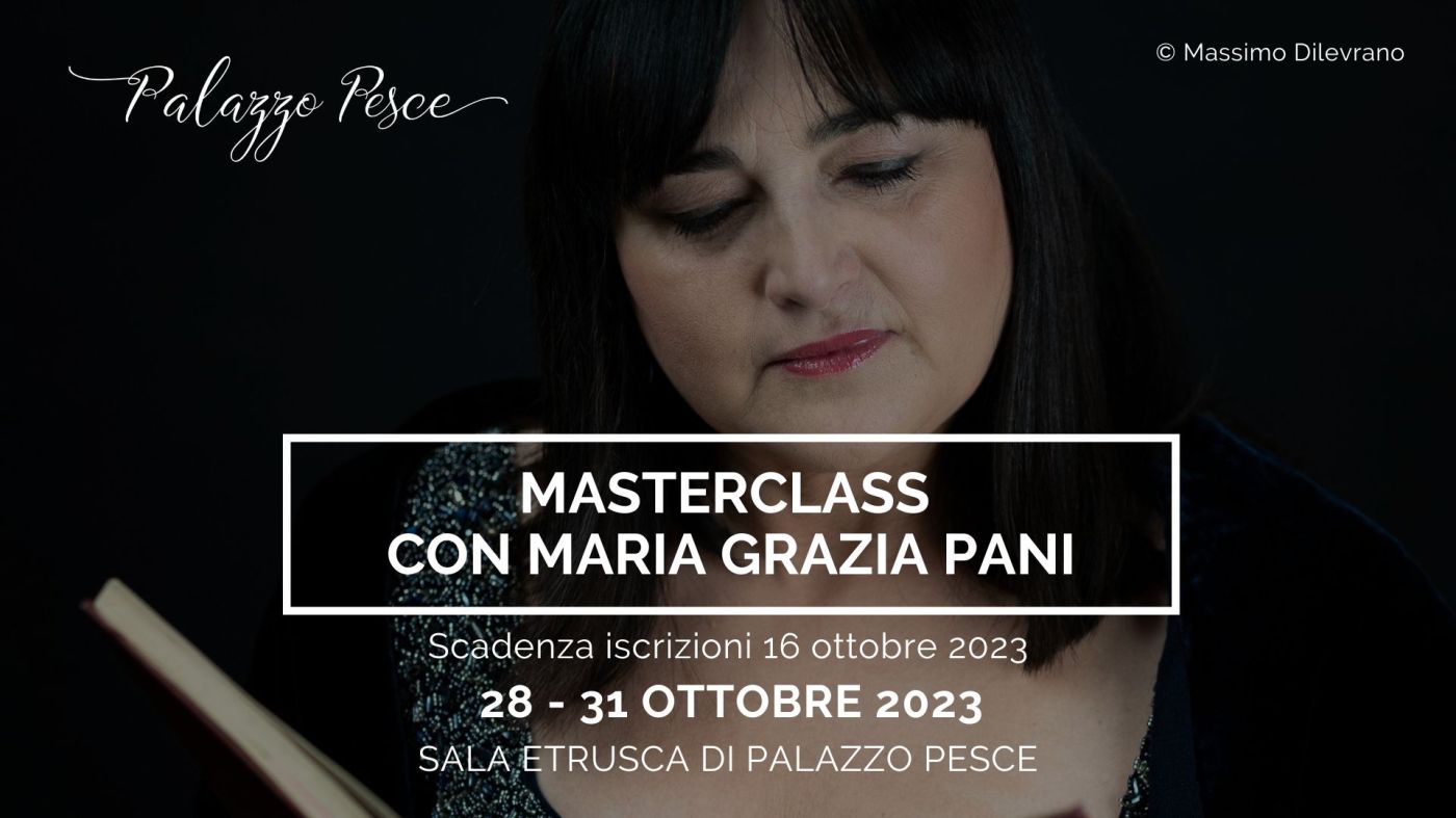 Da sabato 28 a martedì 31 ottobre 2023 la Sala Etrusca di Palazzo Pesce ospita “Belcanto: tecnica vocale e interpretazione”, la masterclass di alto perfezionamento in canto lirico tenuta da Maria Grazia Pani, soprano dal repertorio vasto ed eclettico che da circa trent’anni affianca all’attività di cantante e didatta, quella di autrice e regista.