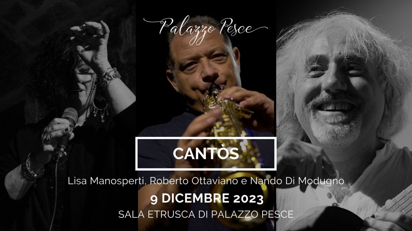 Sabato 9 dicembre 2023 alle ore 21.00 nella Sala Etrusca di Palazzo Pesce risuona “Cantòs” insieme alla voce di Lisa Manosperti, il sax di Roberto Ottaviano e la chitarra di Nando Di Modugno.