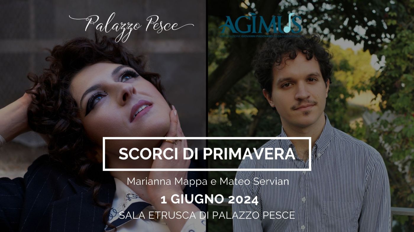 Sabato 1 giugno 2024 alle ore 21.00 la Sala Etrusca di Palazzo Pesce, in collaborazione con l’Agìmus, accoglie gli “Scorci di Primavera” insieme alla voce di Marianna Mappa e al pianoforte di Mateo Servián Sforza.
