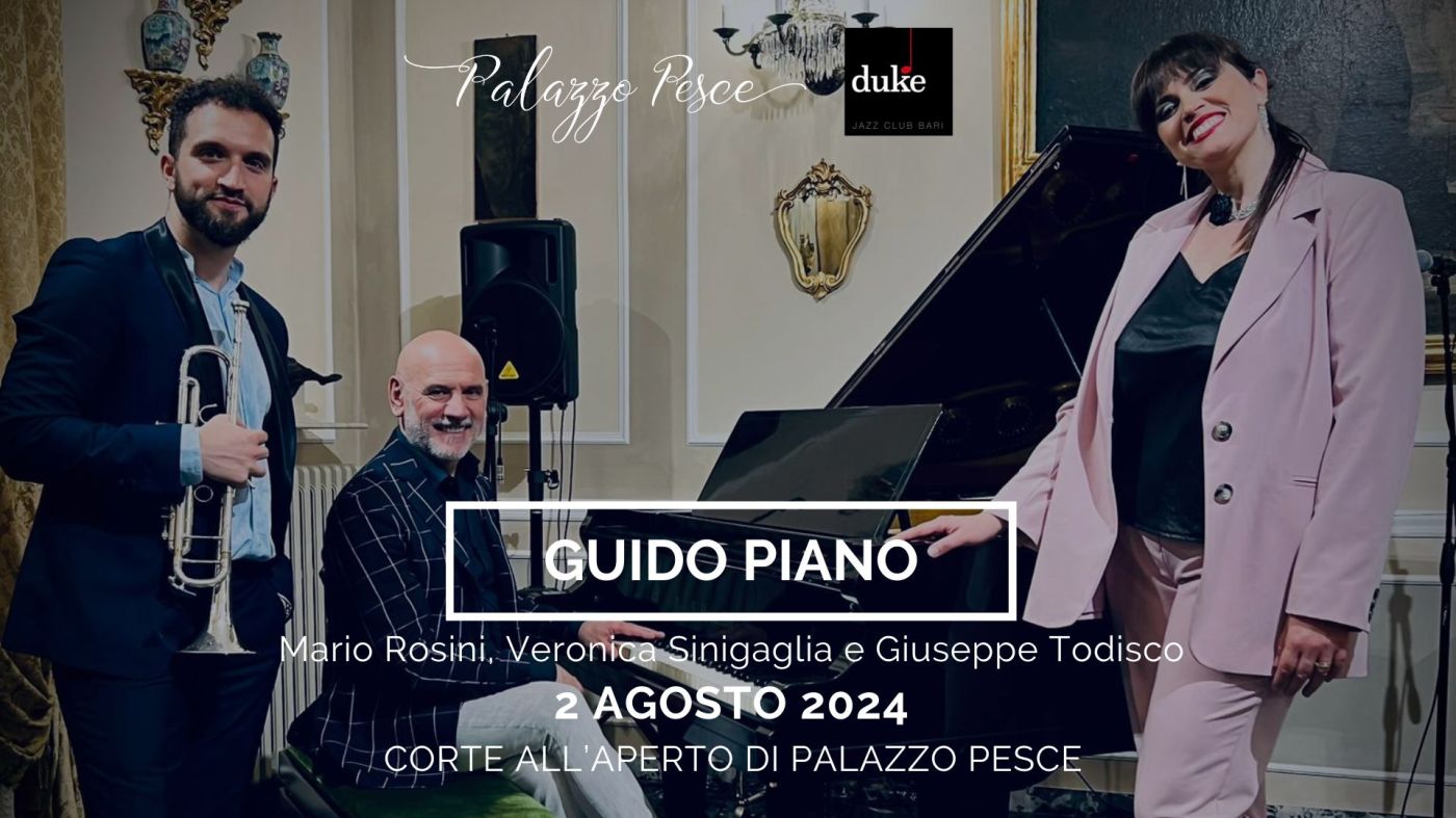 Venerdì 2 agosto 2024 alle ore 21.30 la corte all’aperto di Palazzo Pesce, in collaborazione con il Duke Jazz Club, presenta “Guido piano” con musiche di Concato, Tenco e Martini insieme alla voce di Veronica Sinigaglia, al piano e voce di Mario Rosini e alla tromba di Giuseppe Todisco.