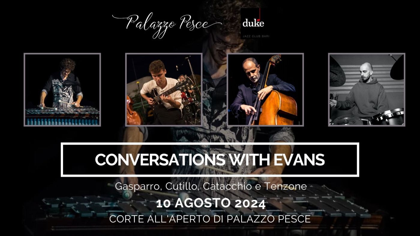 Sabato 10 agosto 2024 alle ore 21.30 la corte all’aperto di Palazzo Pesce, in collaborazione con il Duke Jazz Club, presenta “Conversations with Evans. Omaggio a Bill Evans” con il Vibeguitar Quartet composto da Vitantonio Gasparro al vibrafono, Marco Cutillo alla chitarra, Nico Catacchio al contrabbasso e Vito Tenzone alla batteria.