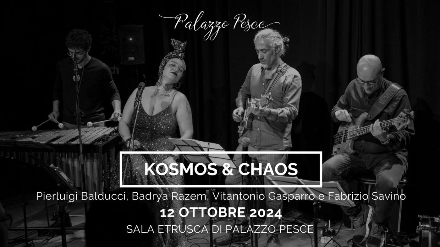 Sabato 12 ottobre 2024 alle ore 21.00 Palazzo Pesce di Mola di Bari presenta Kosmos & Chaos con Pierluigi Balducci al basso, il chitarrista Fabrizio Savino, il vibrafonista Vitantonio Gasparro e la voce di Badrya Razem.