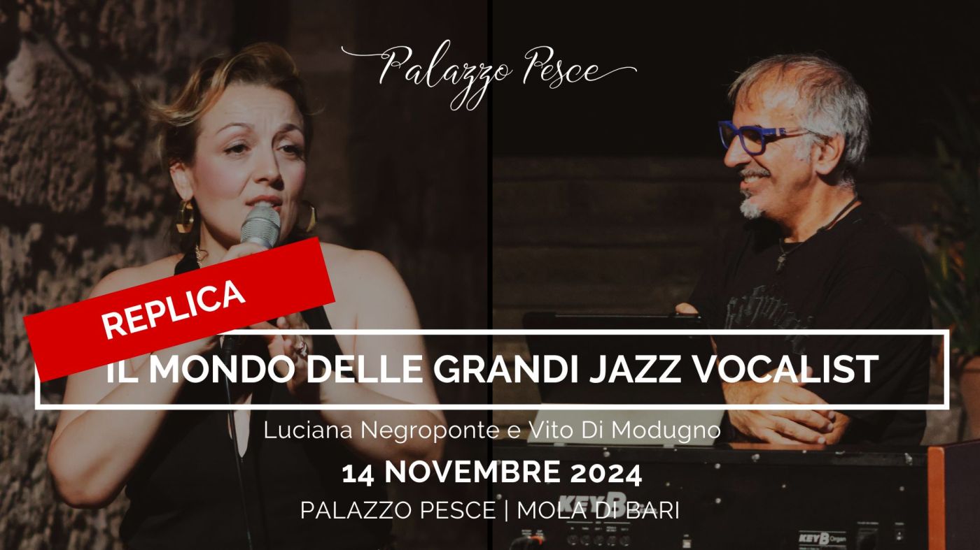 Giovedì 14 novembre 2024 alle ore 21.00 Palazzo Pesce a Mola di Bari replica a grande richiesta “Il mondo delle grandi jazz vocalist: Sarah Vaughan, Ella Fitzgeraldo e Billie Holiday” insieme alla voce di Luciana Negroponte e al piano ed hammond Vito di Modugno.