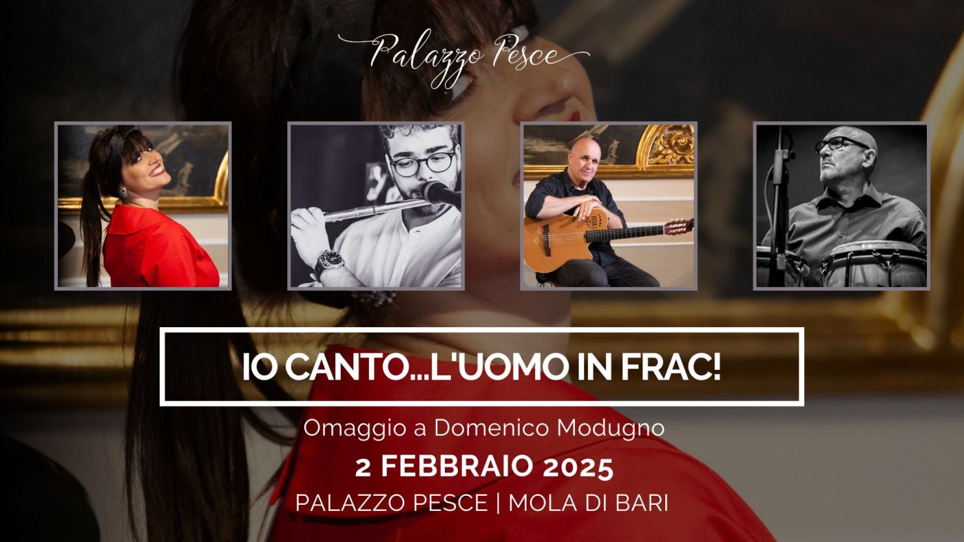 Domenica 2 febbraio 2025 alle ore 20.00 la Sala Etrusca di Palazzo Pesce a Mola di Bari rende omaggio a Domenico Modugno con “Io canto… l’uomo in frac”, insieme alla voce di Veronica Sinigaglia, al flauto di Aldo Di Caterino, alla chitarra di Nico Acquaviva e alle percussioni di Enzo Falco.