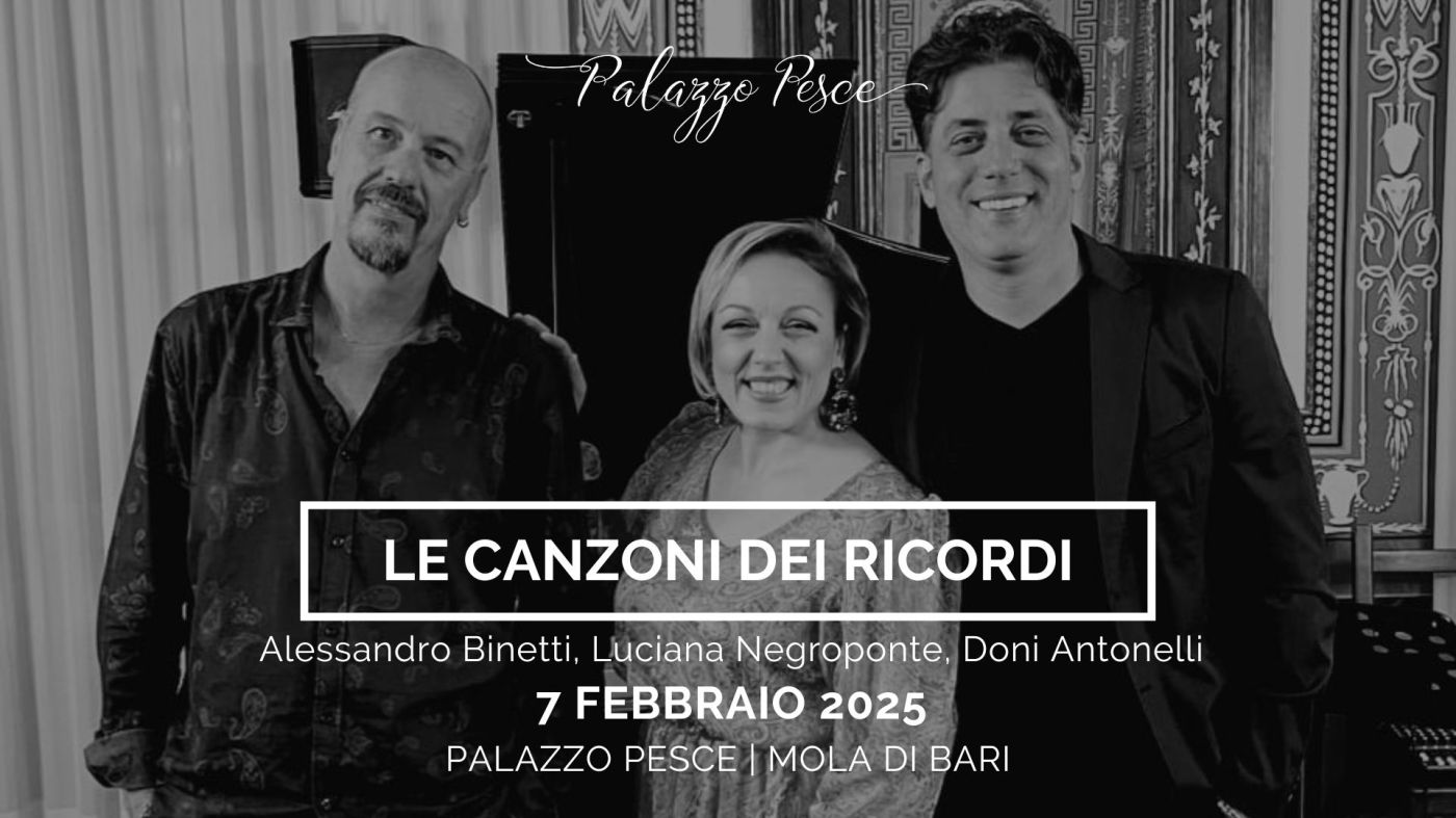 Venerdì 7 febbraio 2025 alle ore 21.00, Palazzo Pesce presenta Le Canzoni dei ricordi con Luciana Negroponte alla voce, Alessandro Binetti al pianoforte e Doni Antonelli alla tromba.